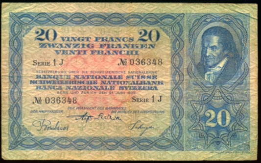 SWITZERLAND P.39a 1929 (first day of issue) 20 Franken F