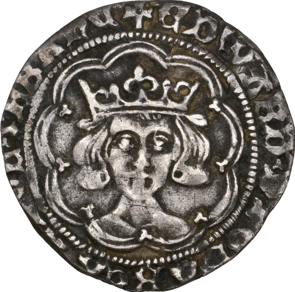 - Obv: Crowned facing bust, trefoils at cusp