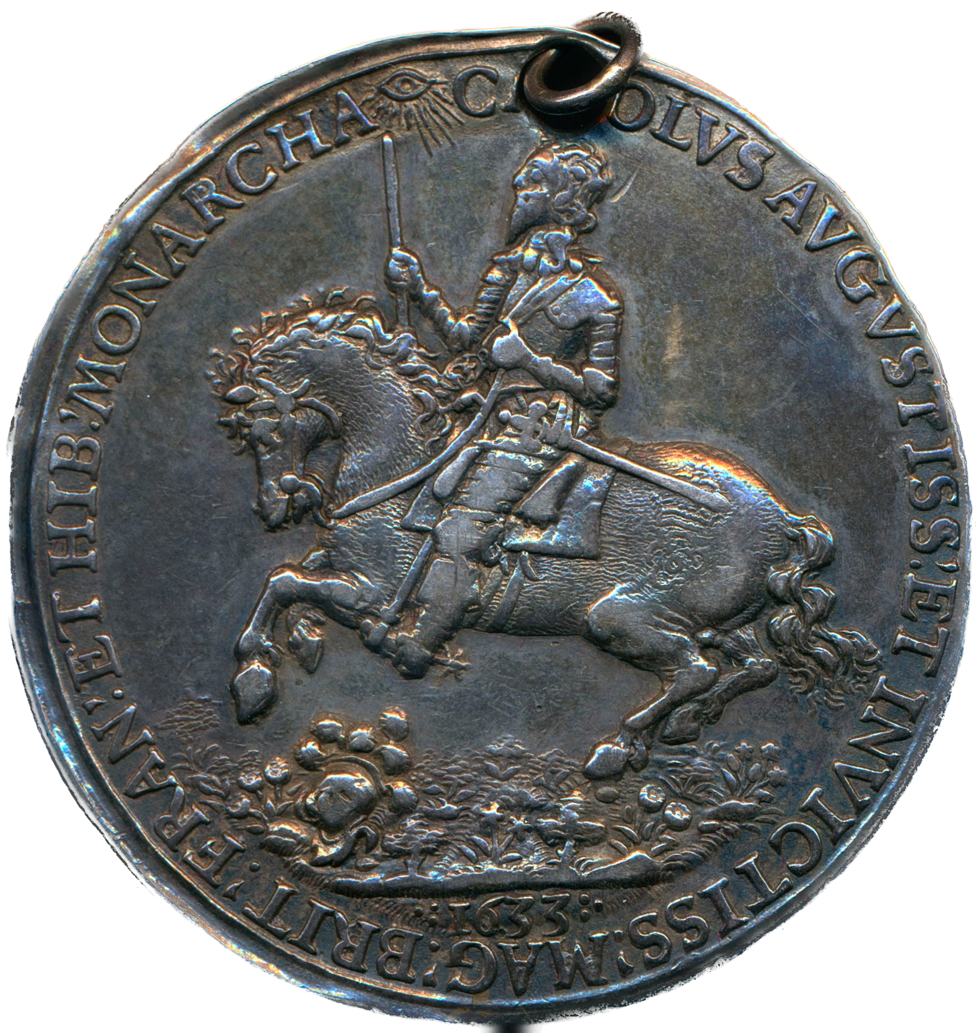 Obverse: Equestrian figure of Charles I holding an upright baton.