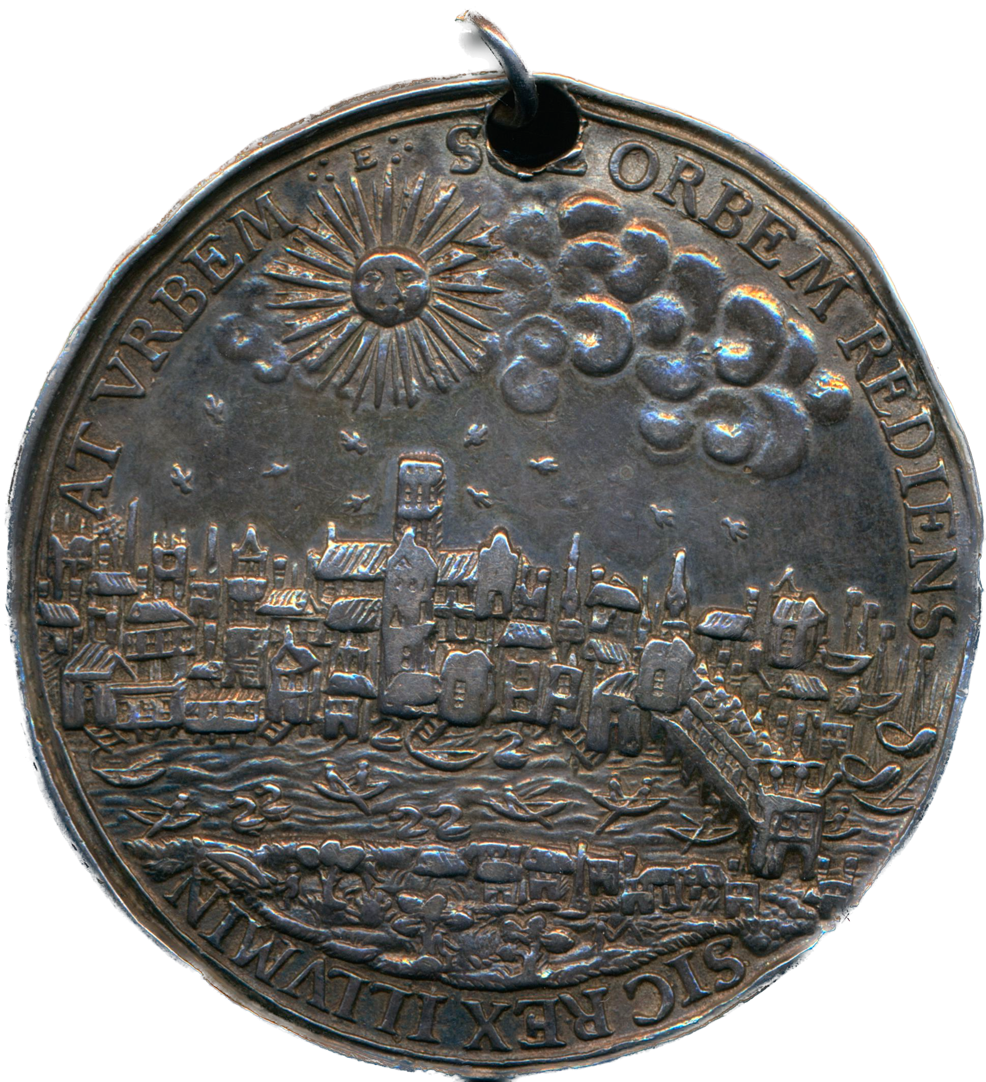 Reverse: View of London seen from the south bank of the Thames, above radiate sun.