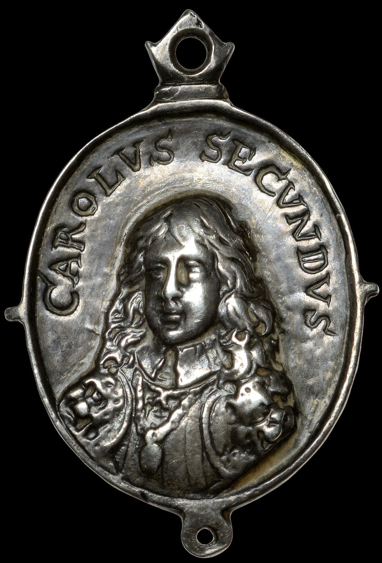 - Obverse: Bust of Charles II, three-quarters left, hair long in plain falling collar. rich armour, with lions heads on shoulders,.