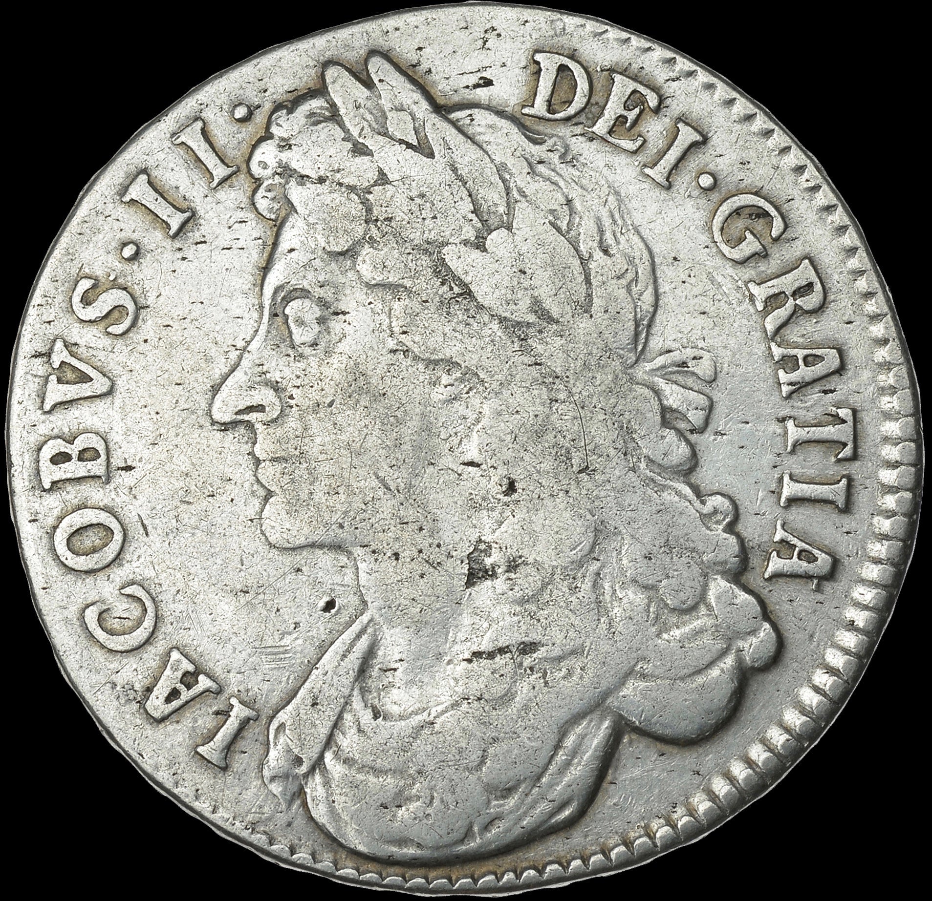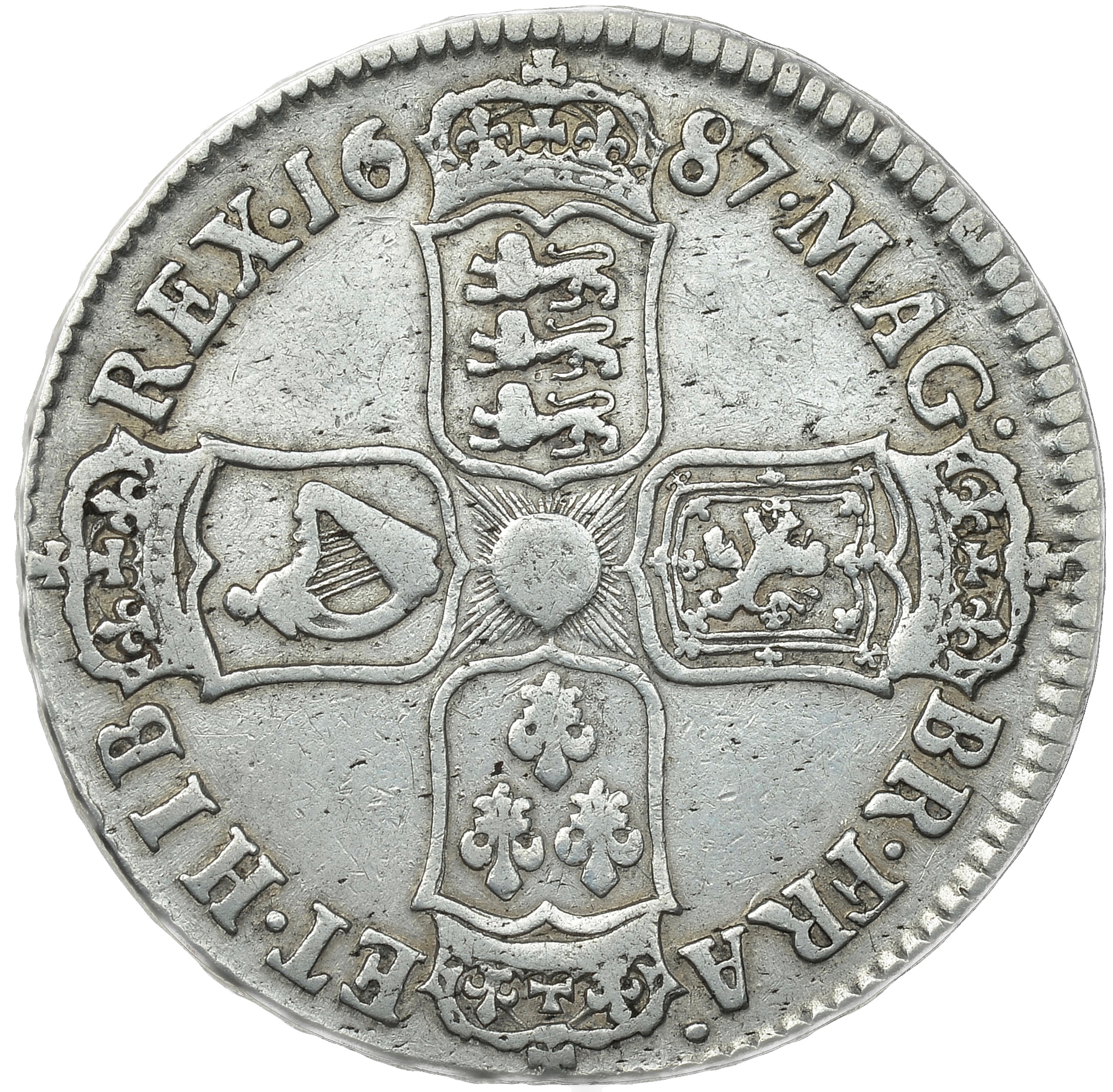 1687 6 over 8 Halfcrown Second bust Edge TERTIO S3408 ESC 755 Excessively rare (R4) GF