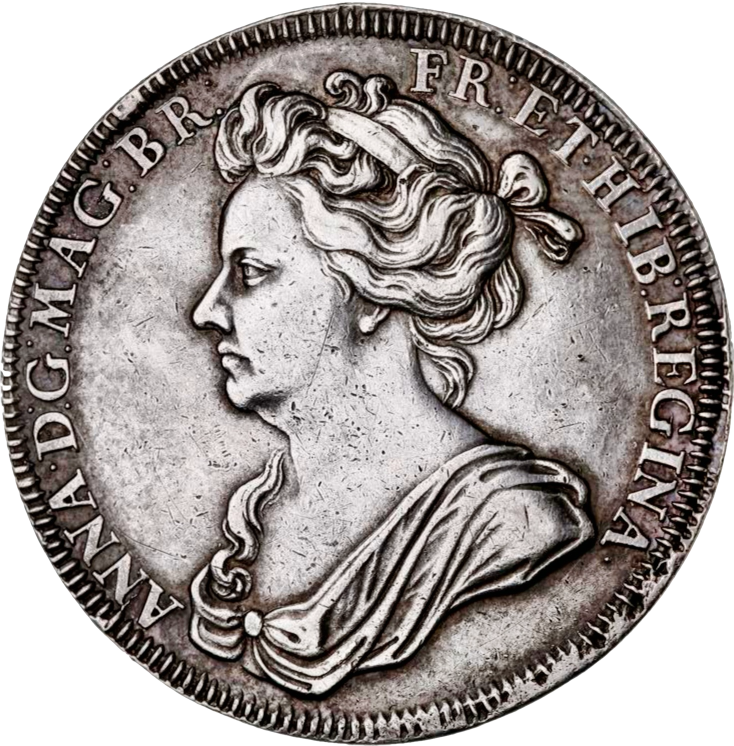 Obverse: Bust of Anne, left, hair bound with fillet, lovelock on the right shoulder, in gown fastened with brooch in front.
