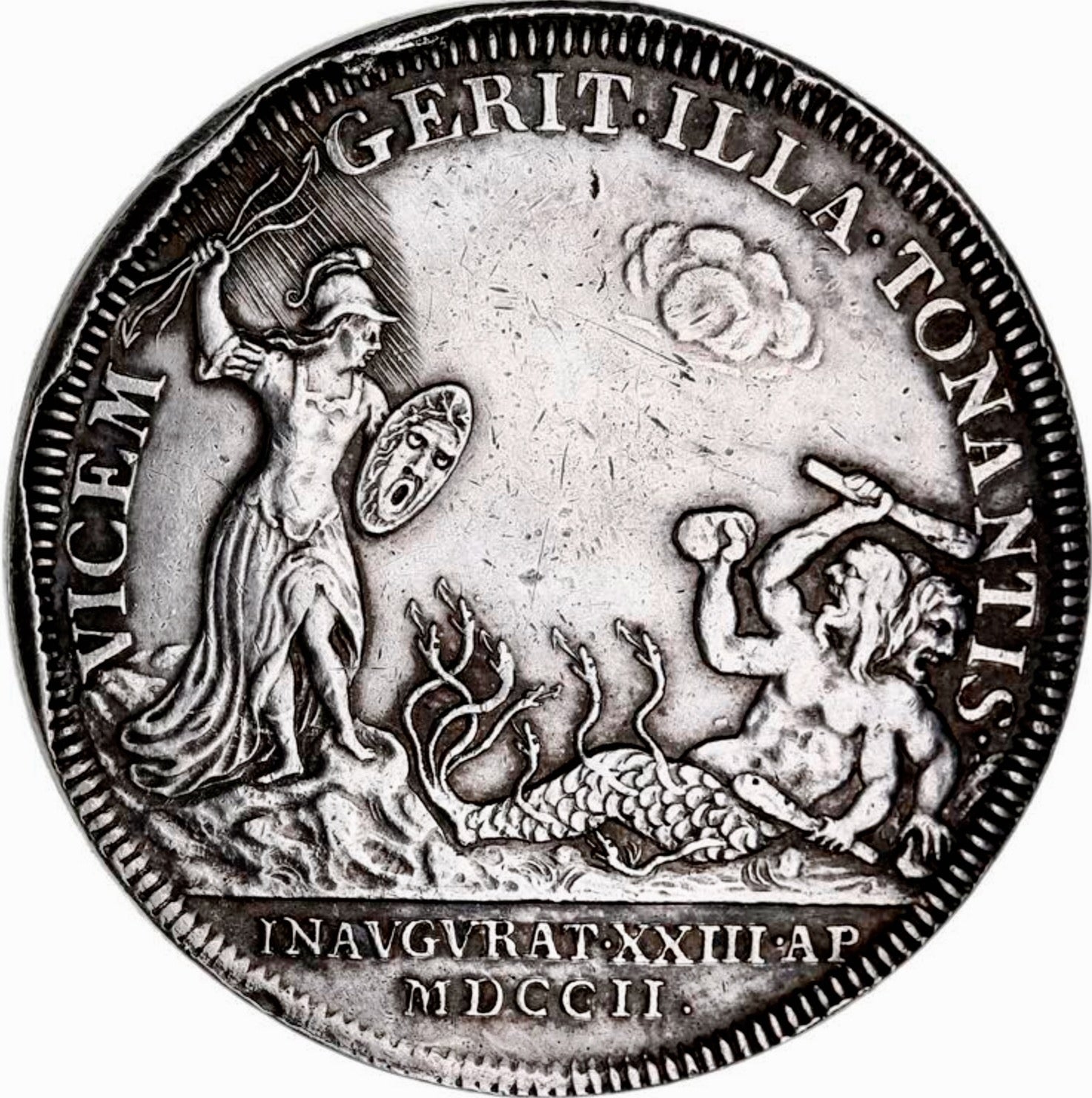 Reverse: Anne, as Pallas, hurls thunder against a double-headed and four-armed monster, holding clubs and stones and whose lower limbs terminate in snakes.