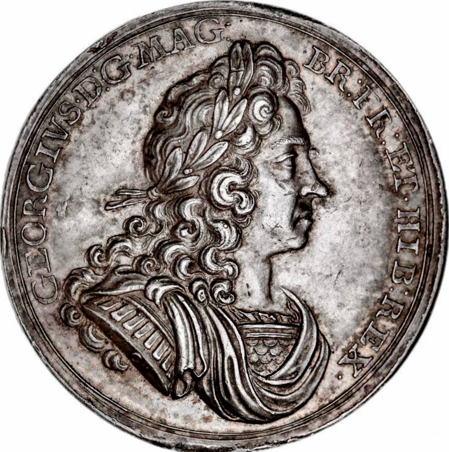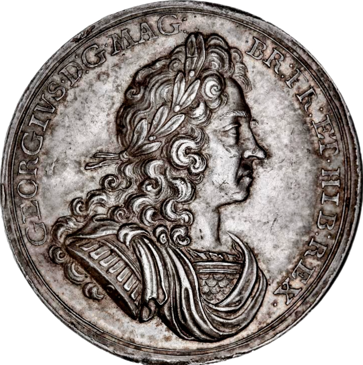 Obverse: Bust of George I, right, hair long, in scale armour with straps on the shoulder and mantle looped on the shoulder.