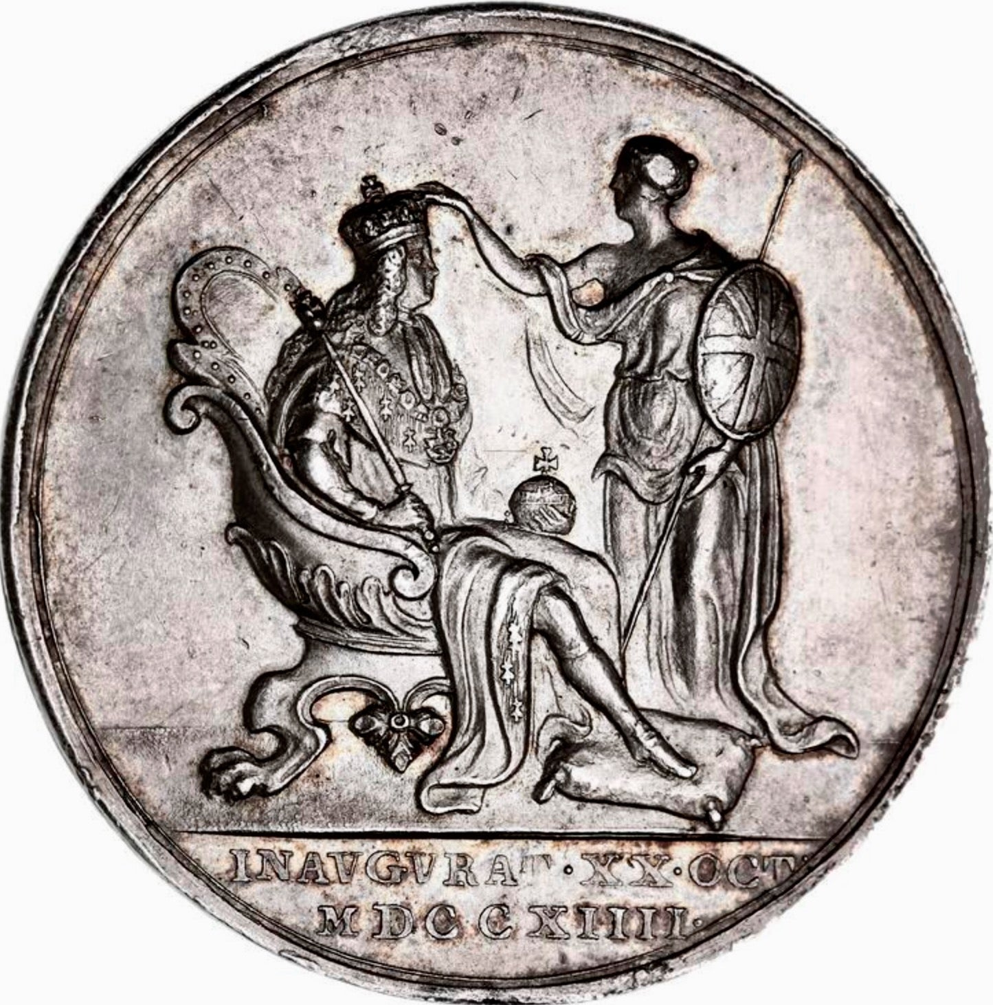 Reverse: The King, in royal robes, seated right, in a shell formed chair, is crowned by Britannia, holding her spear and shield.