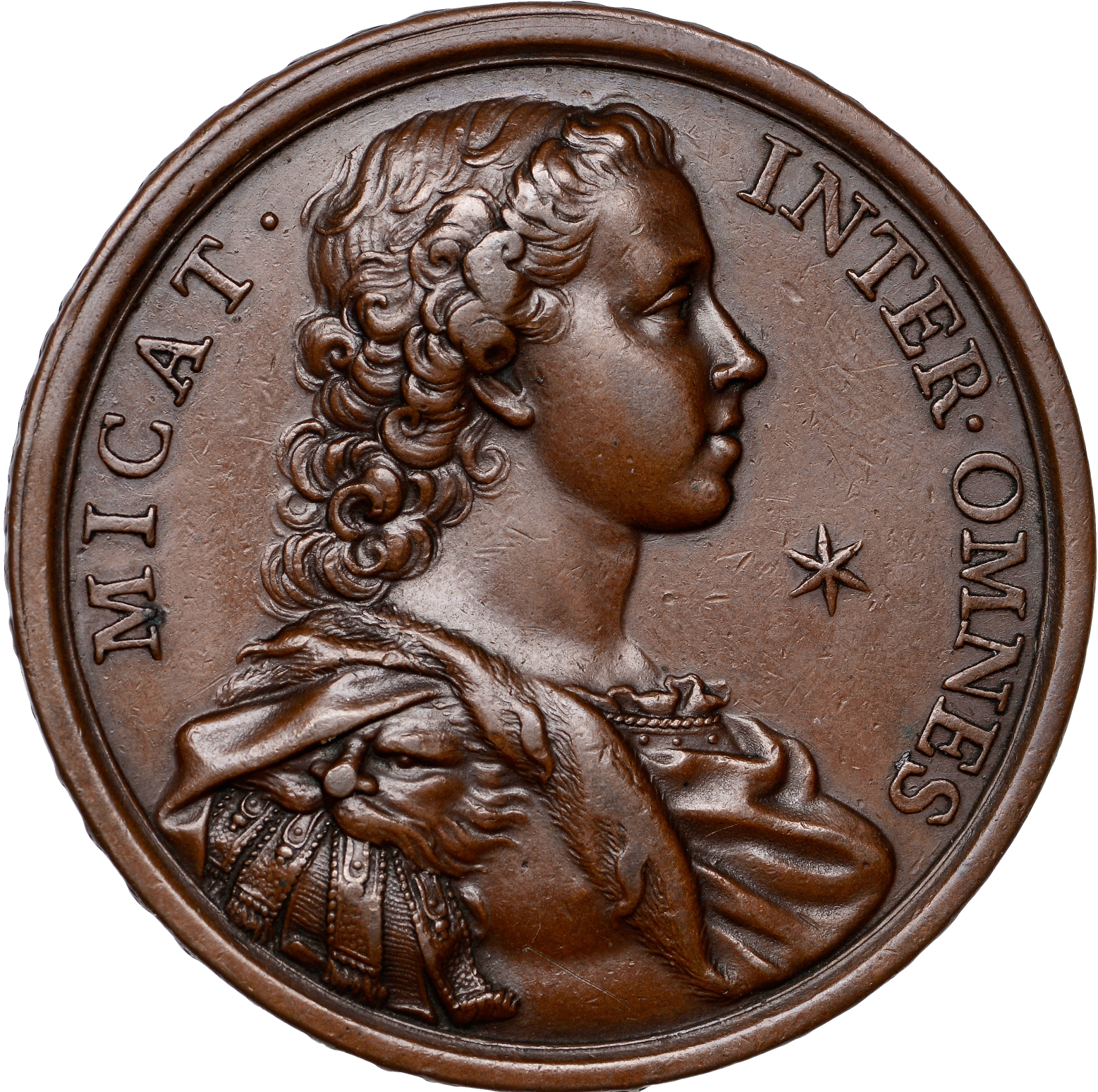 Obv: Armored and draped bust of Prince Charles Edward Stuart right, star before; MICAT. INTER. OMNES