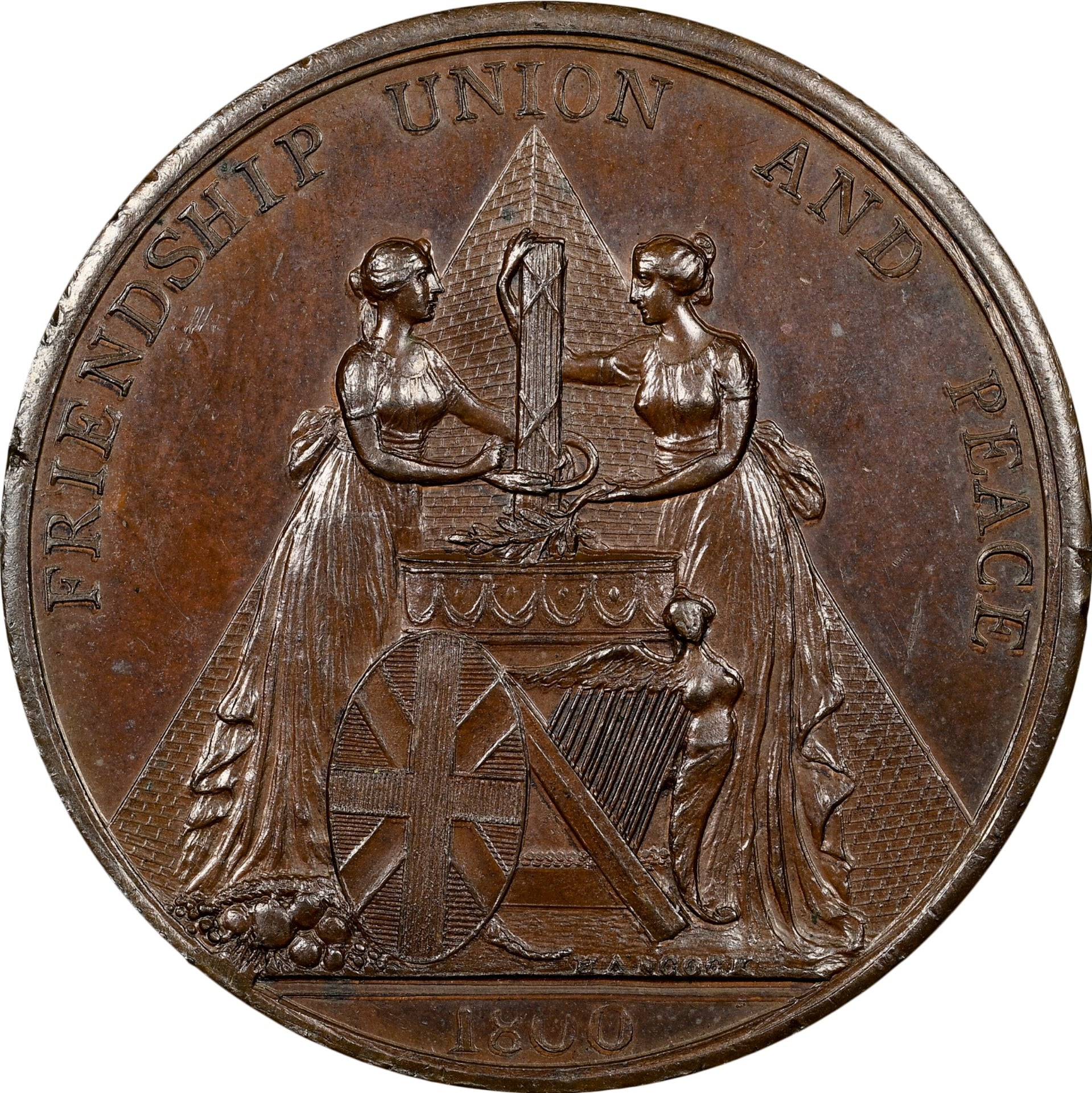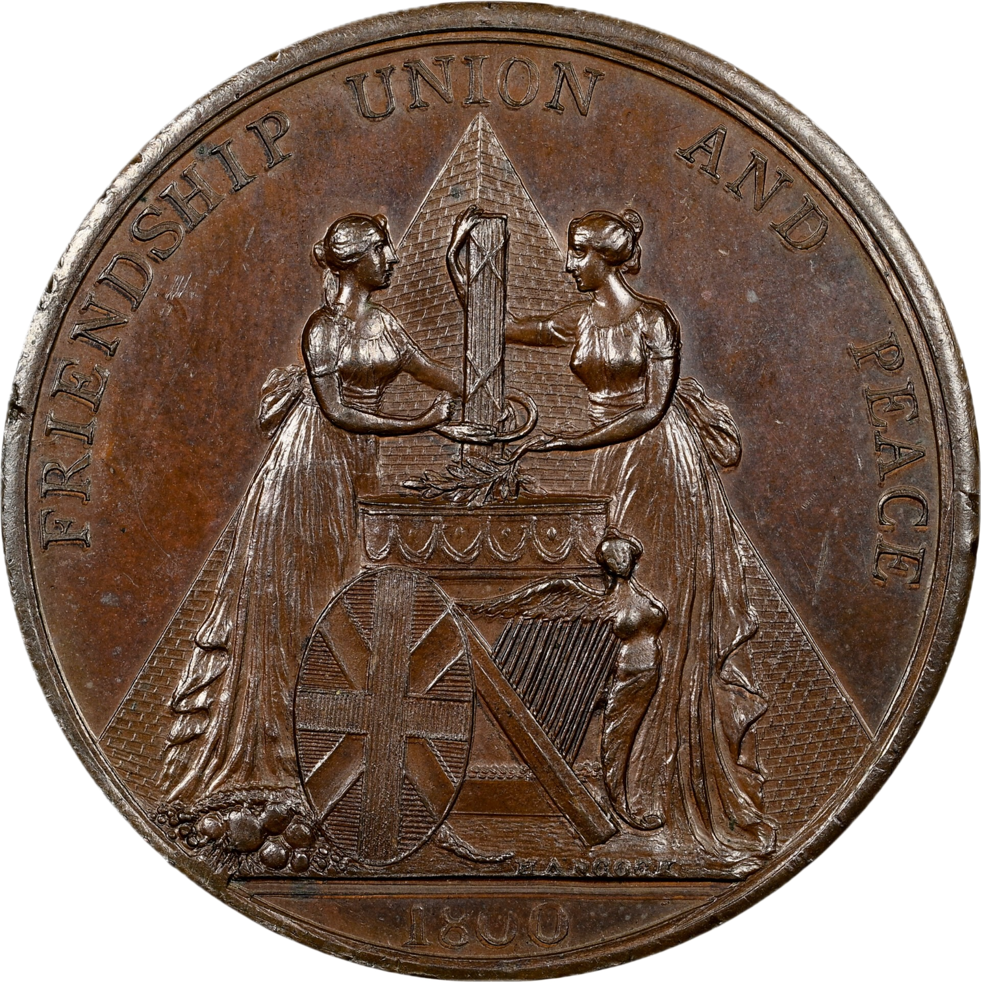 Obverse: FRIENDSHIP UNION AND PEACE, Britannia and Hibernia stand before a pyramid, 1800 in the exergue