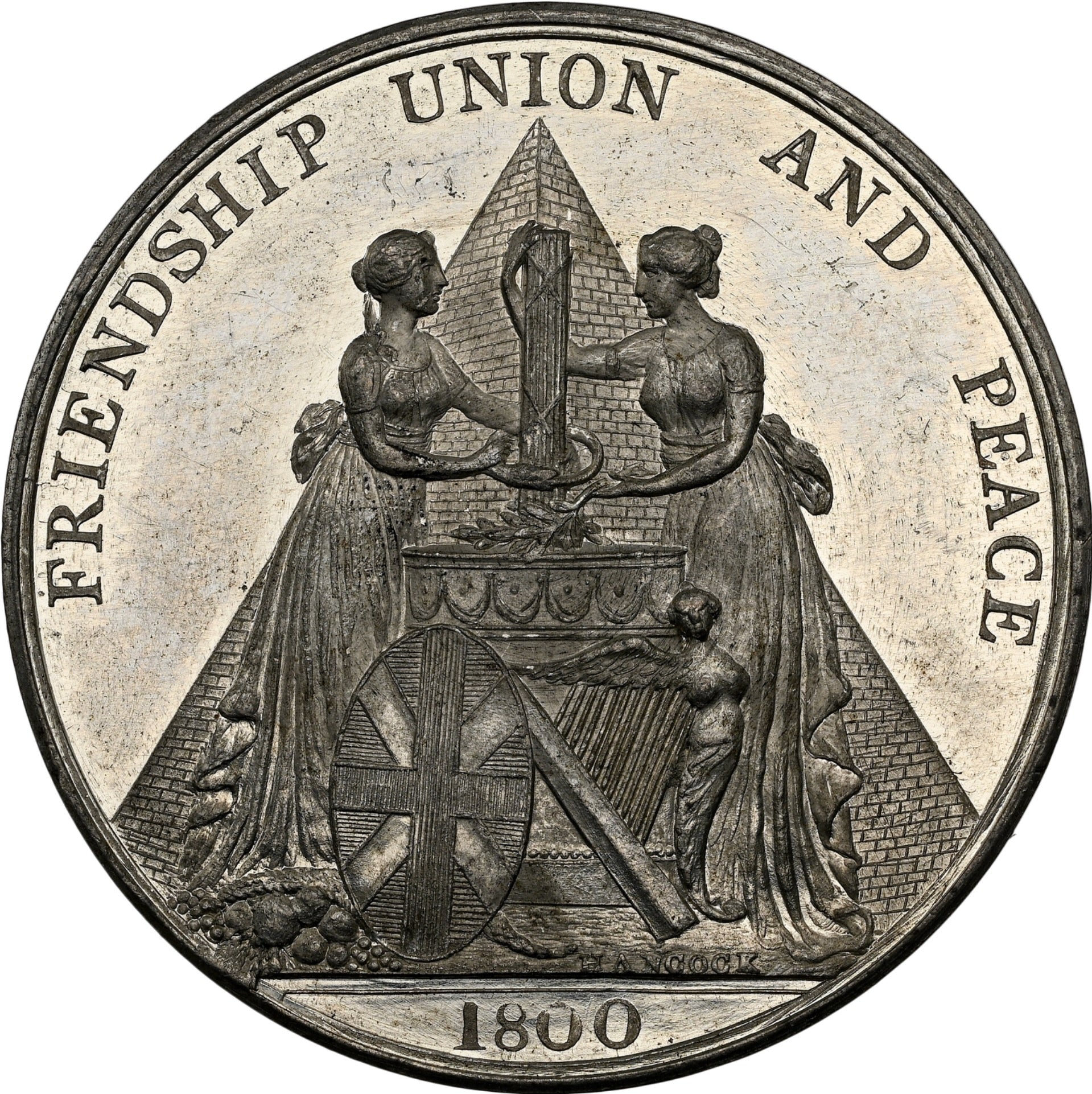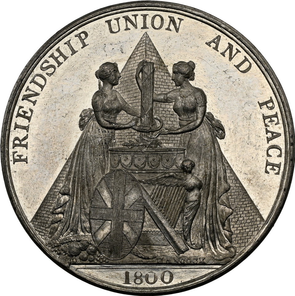 Obverse: FRIENDSHIP UNION AND PEACE, Britannia and Hibernia stand before a pyramid, 1800 in the exergue