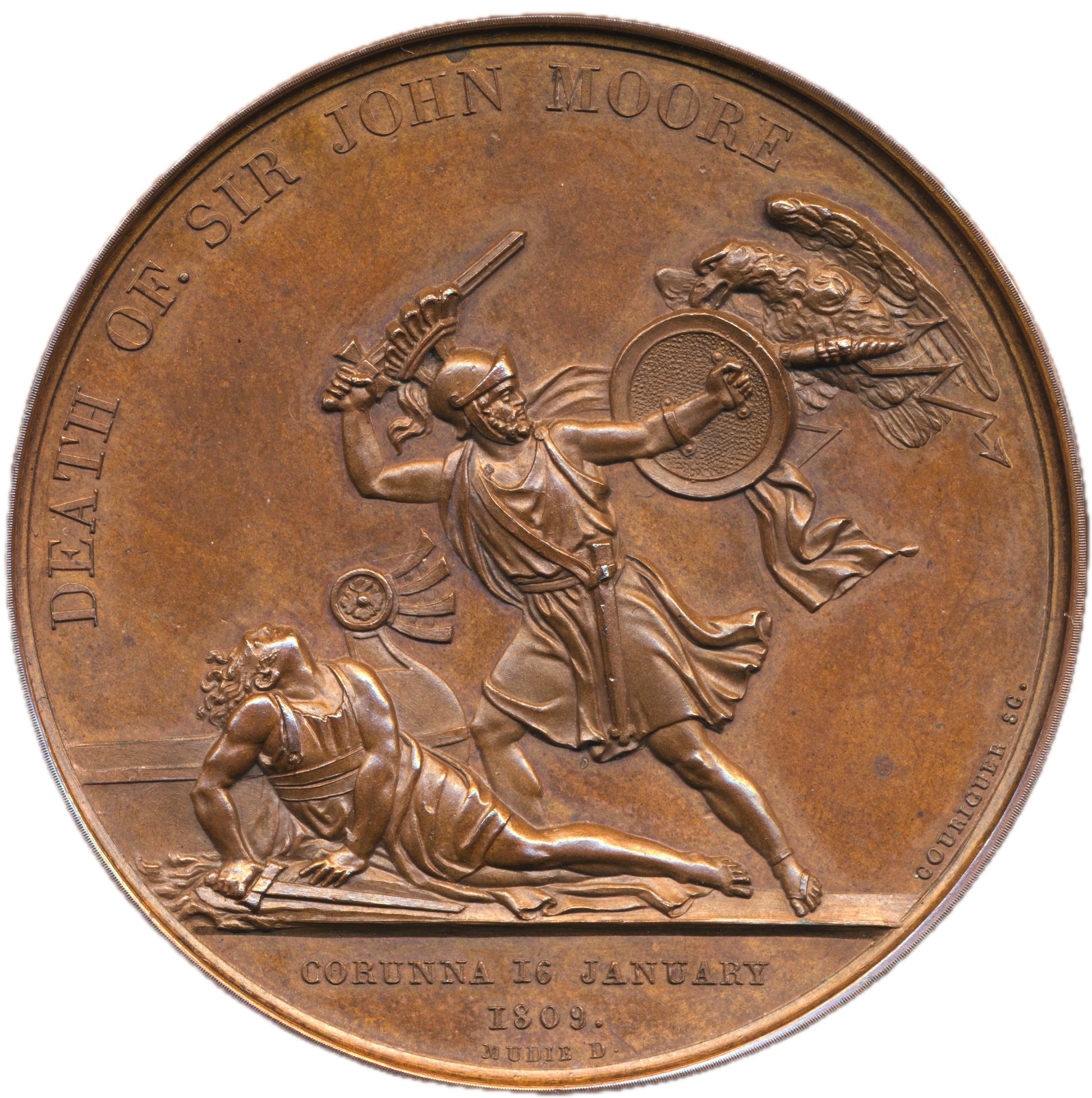 Reverse: a gladiator shields the fallen figure of Moore from the French eagle