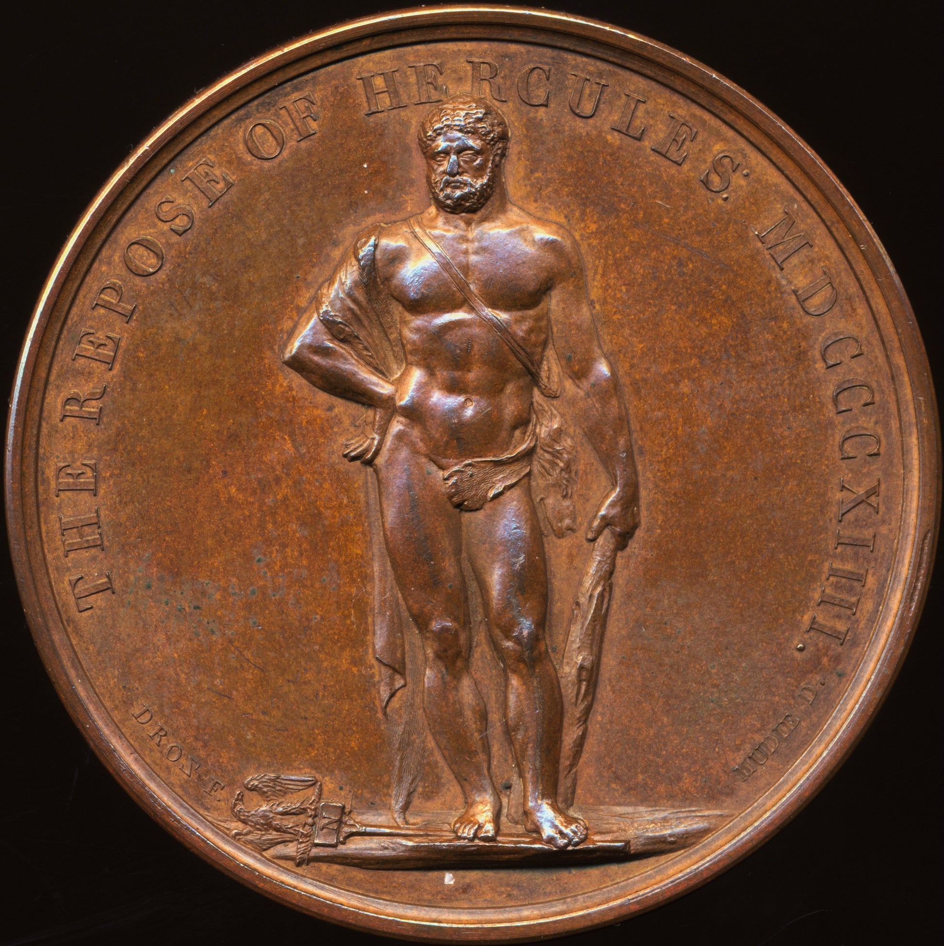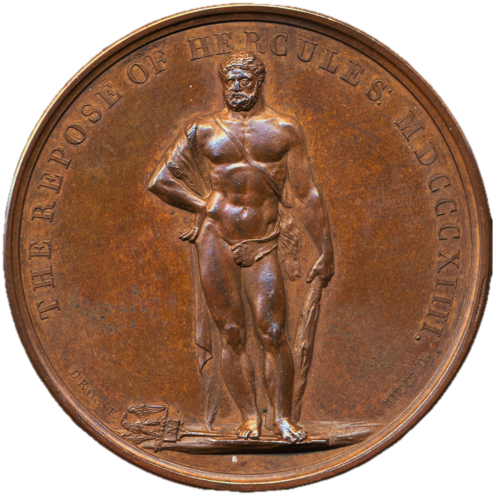 Rev: Hercules stands, his foot on a standard.
