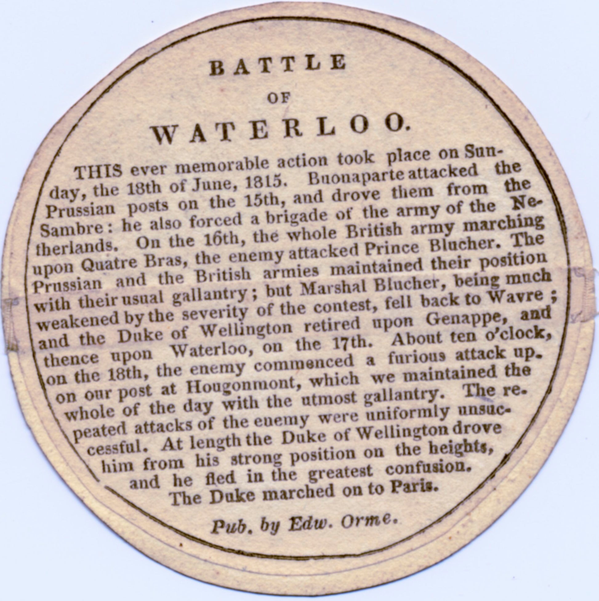 Containing thirteen 67mm discs engraved by Edward Orme depicting actions at various battles, each with a narrative description on the reverse.