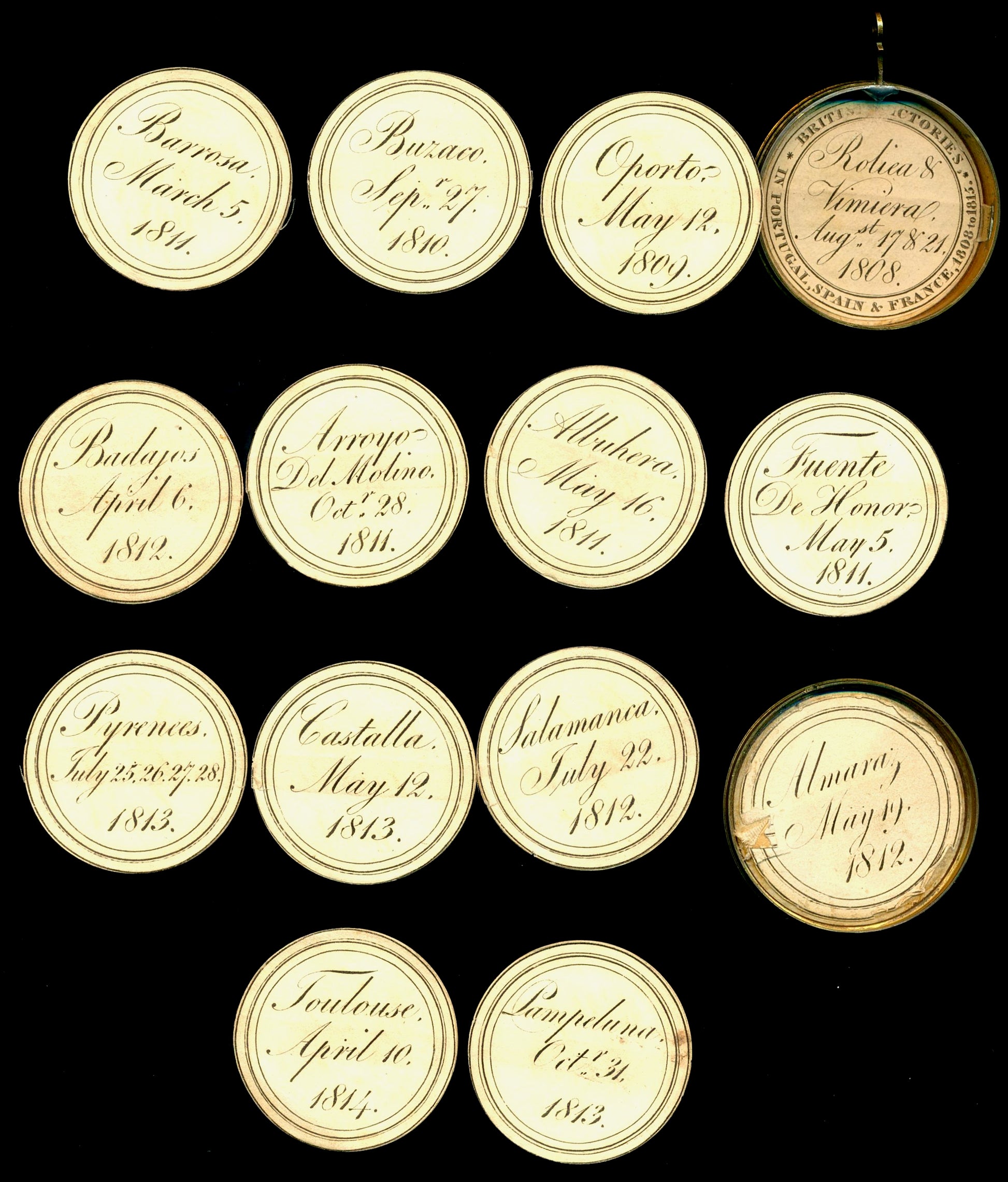 Containing the complete set of 14 printed roundels, including one in lid and base, inscribed with the names and dates of Wellington's victoriesBy Nicolas Guy Antoine Brenet