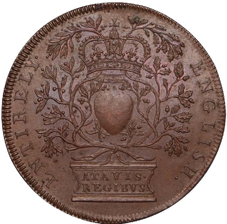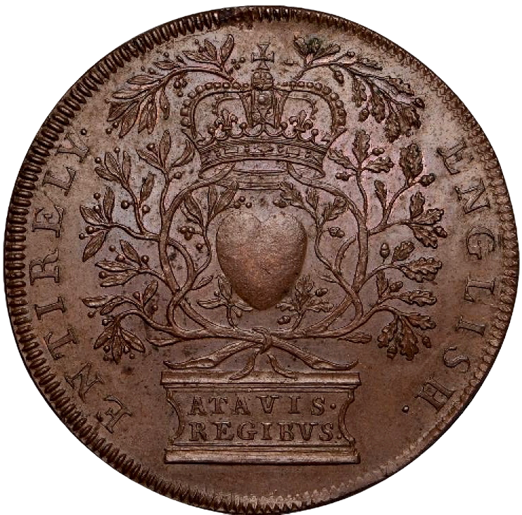 Reverse: A heart enclosed within branches of oak and laurel, which pass through a crown above and rest on an inscribed pedestal.