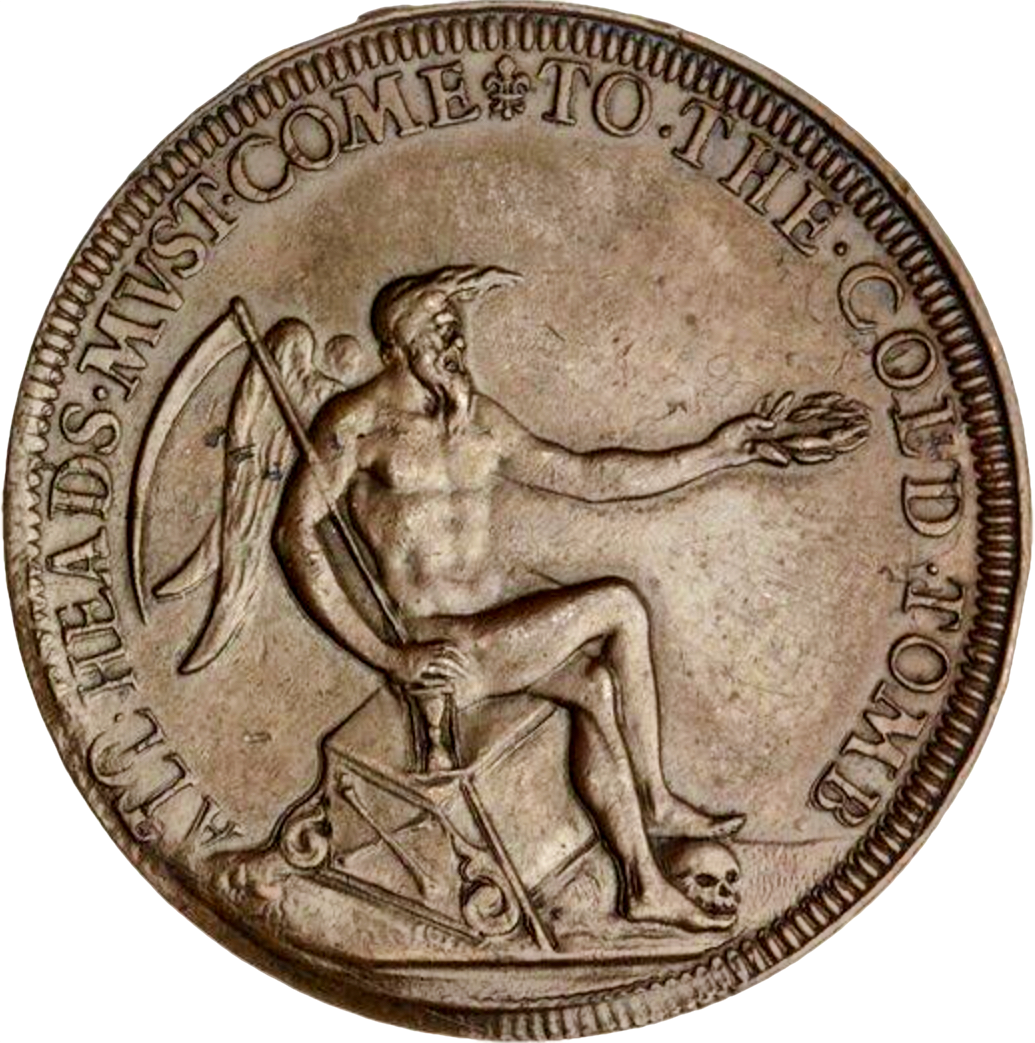 Obverse: Chronus, cradling scythe in arm, seated right on ornate low base, resting hand on hourglass and holding wreath; skull at feet