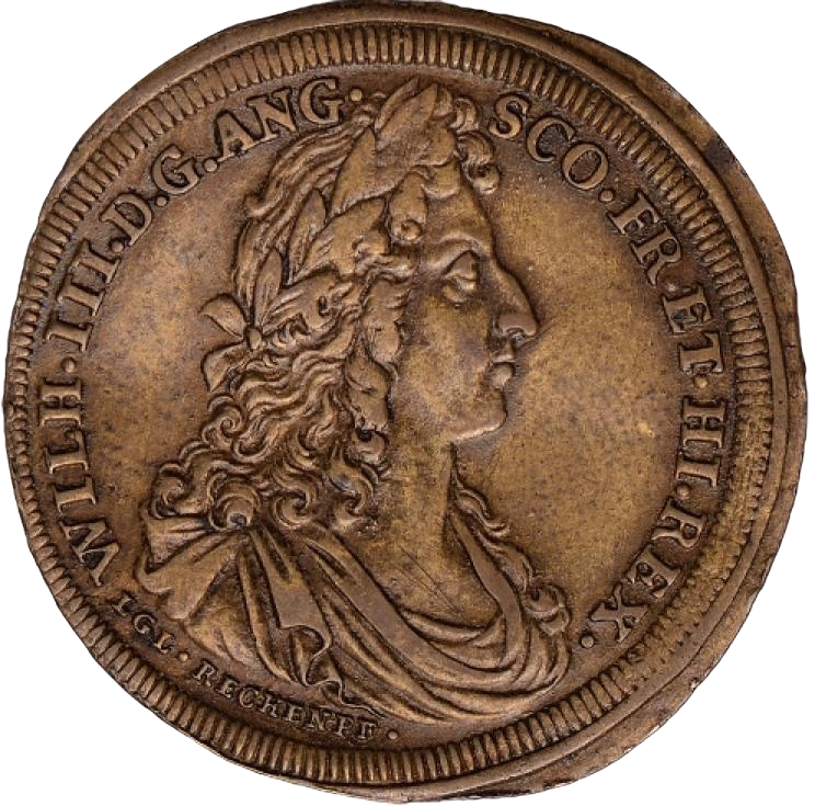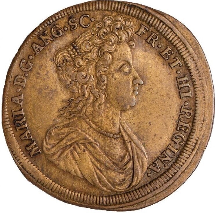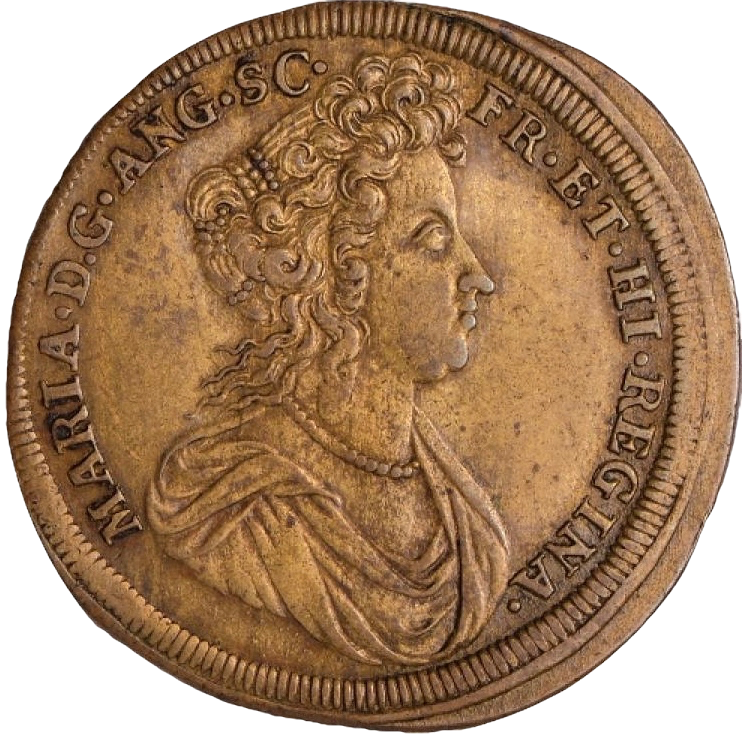 Reverse: Mary, hair bound with pearls, some loose locks, with pearl necklace and mantle..