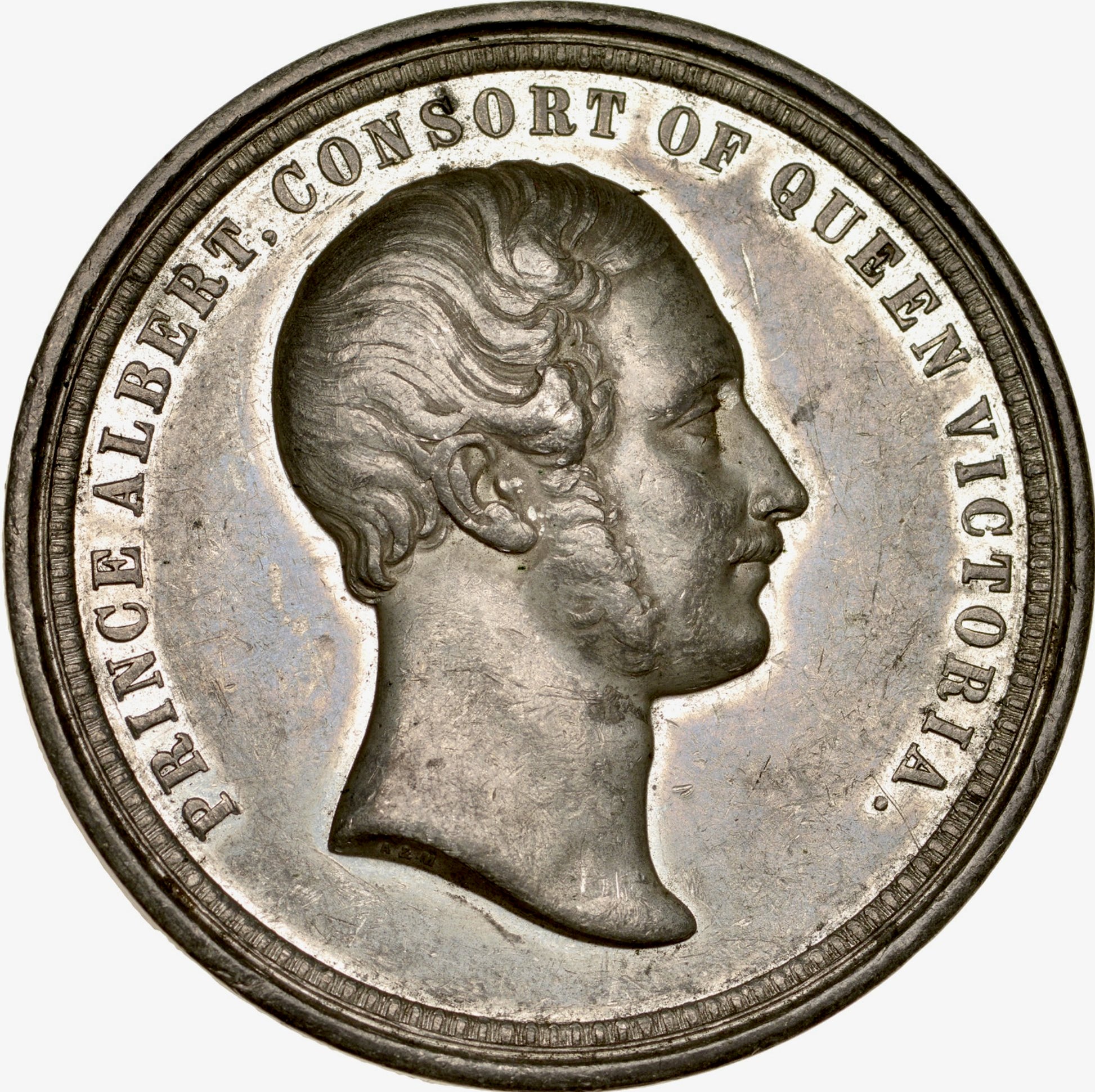 Obverse: Bare head of Prince Albert left within a wreath of oak and laurel.