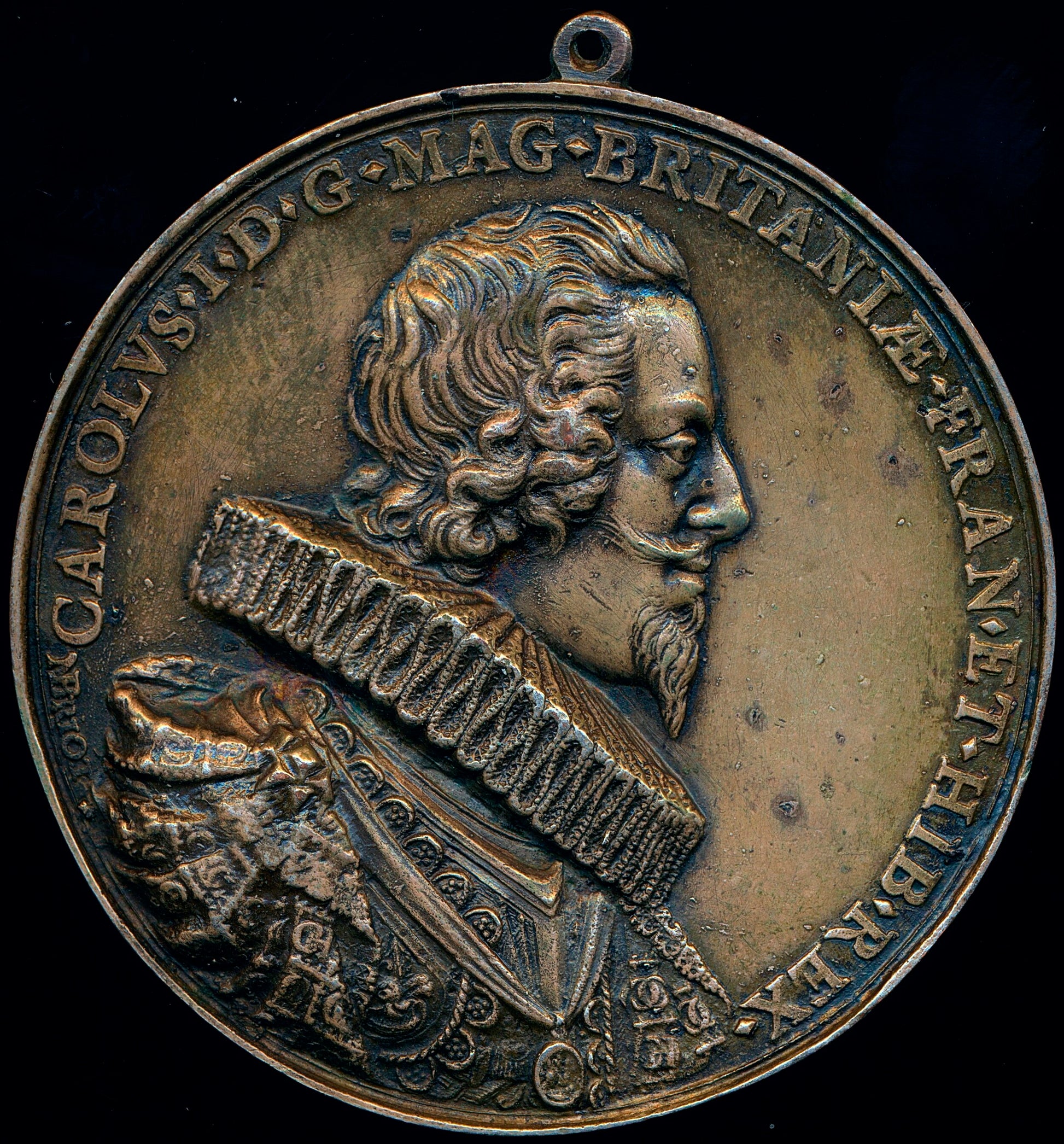 Obverse: Charles I, armoured and draped, wearing a large ruff CAROLVS. I. D.G. M.A.G. BRITANNIAE. FRAN. ET. HIB. REX.
