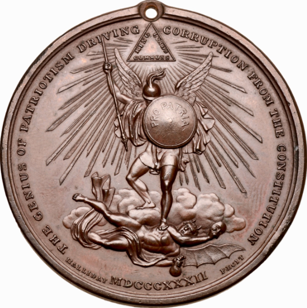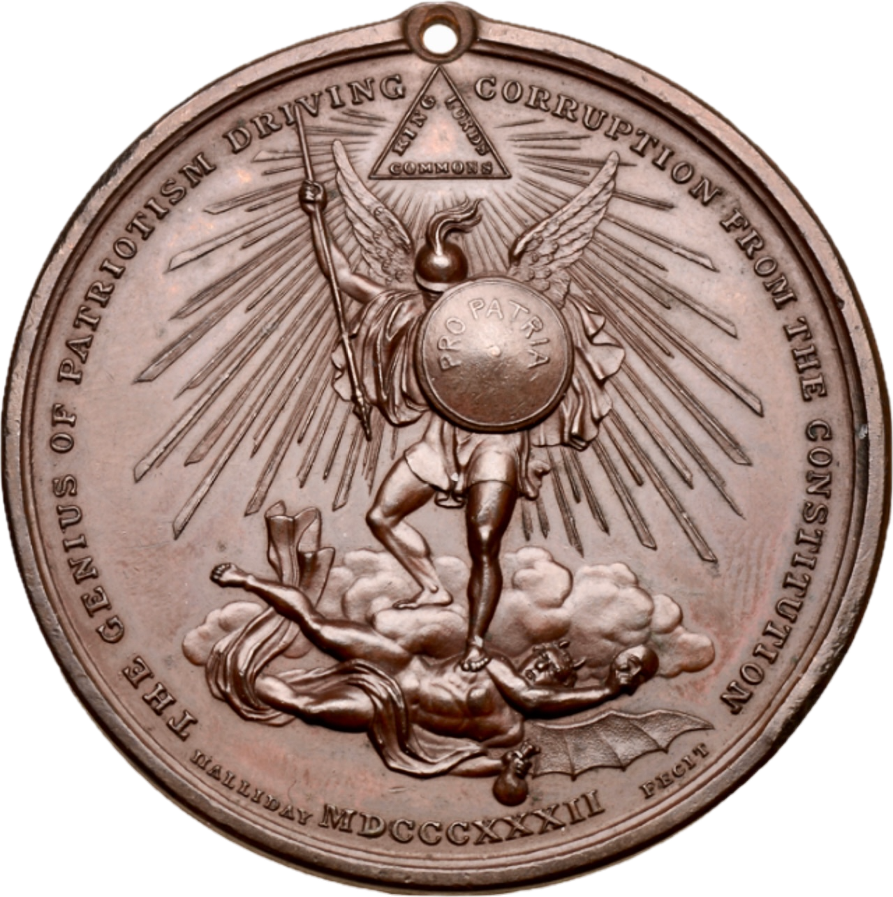 Obv: Allegorical figure of Patriotism standing on a cloud spearing Corruption at her feet.
