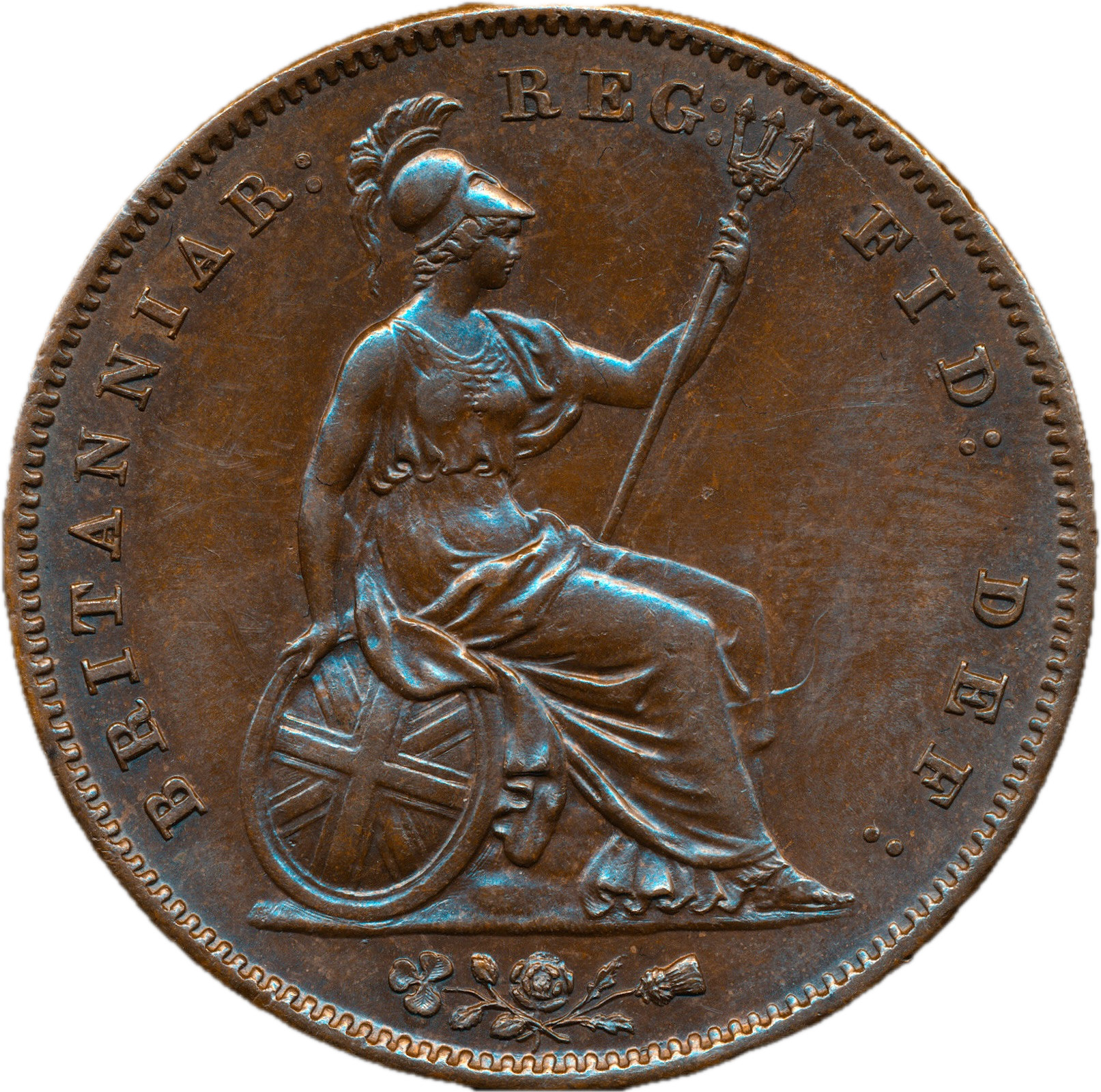1858/7 Penny WW Far colon Ornamental trident Large date BMC 1516 GEF