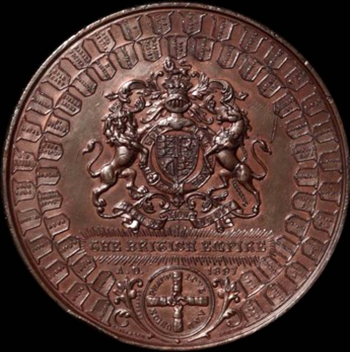 Reverse: Royal Arms with supporters, clasped arms cruciform within a circle, names of British territories on 55 shields in two concentric circles.