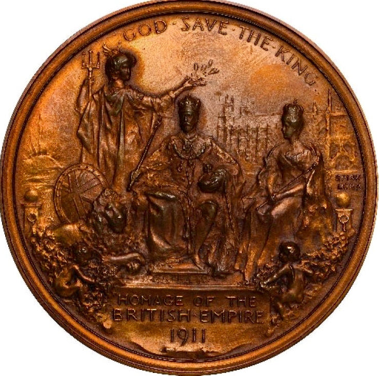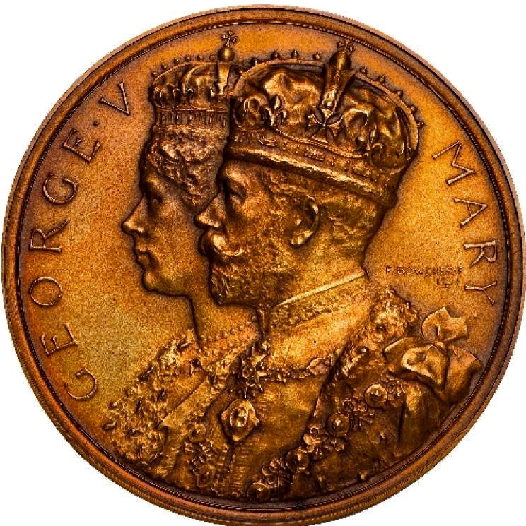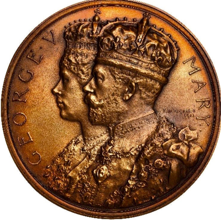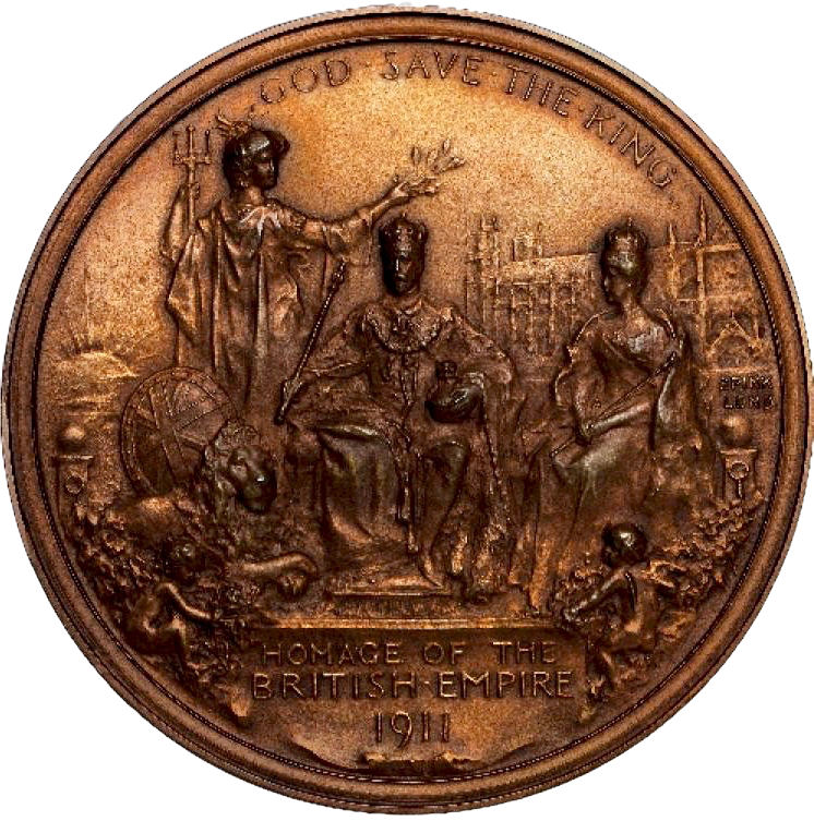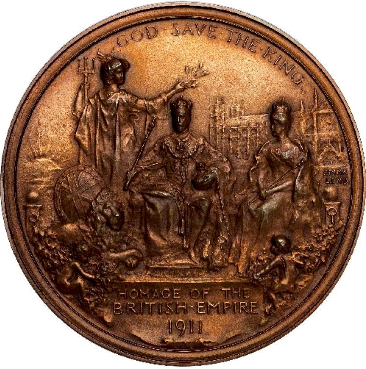 Reverse: Britannia standing with British lion left, King and Queen seated upon a dias.