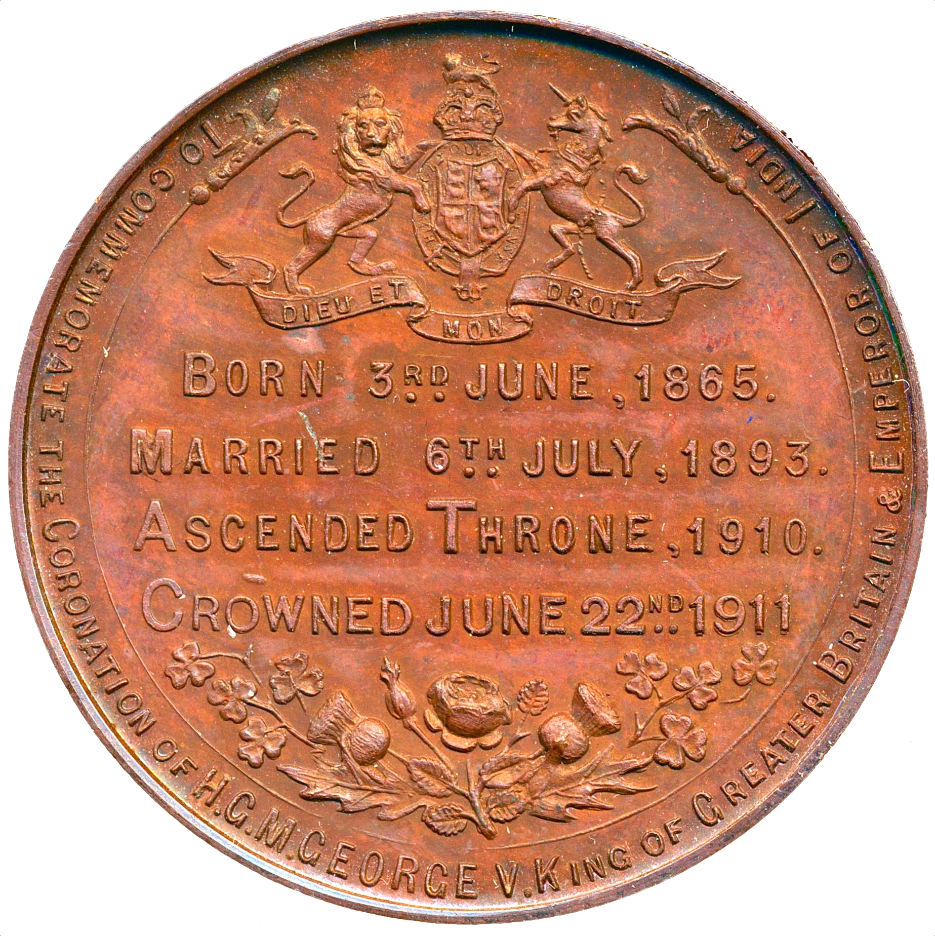 Reverse: The Royal Arms with supporters. Inscription above wreath of oak and laurel.