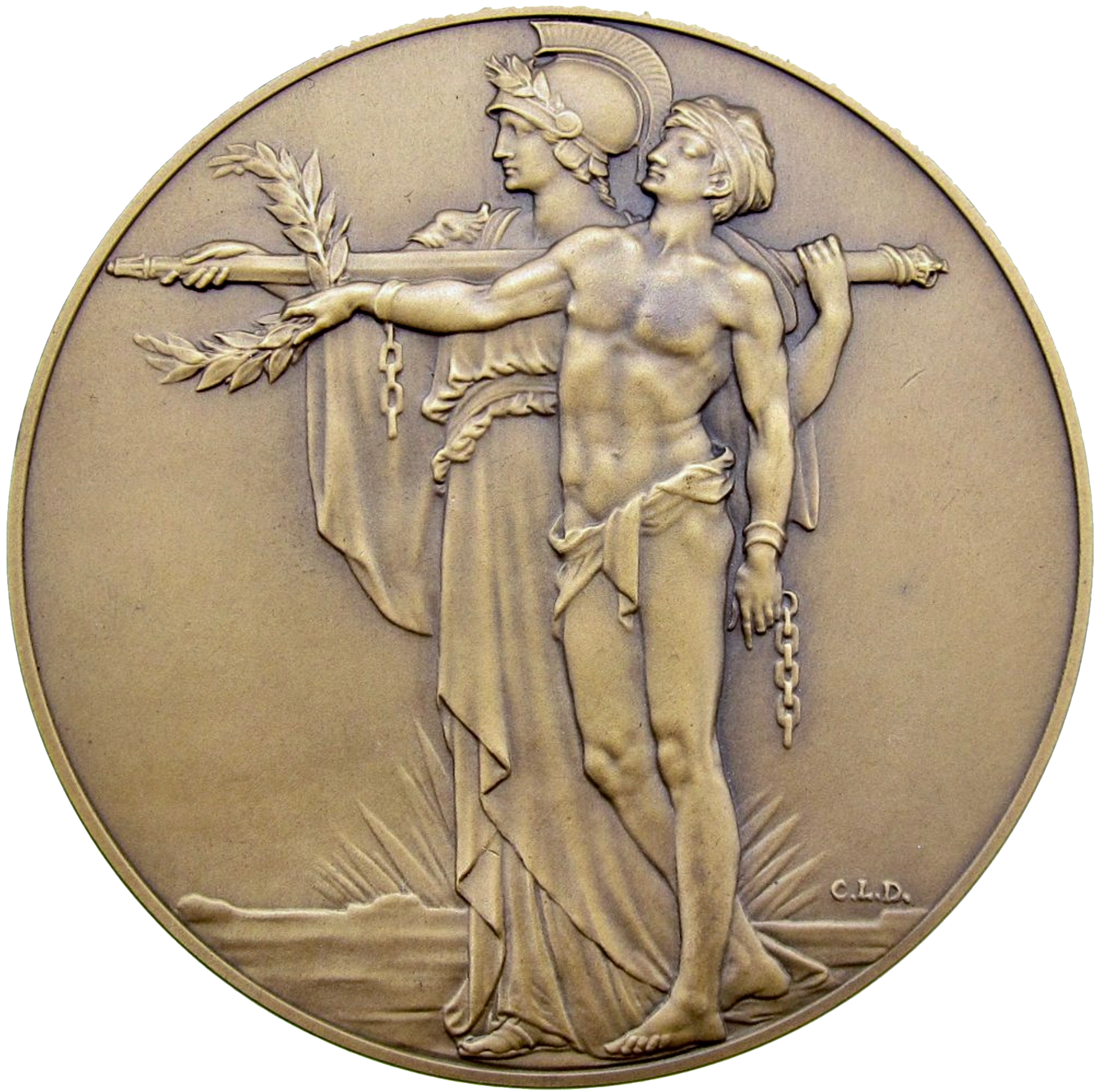 Obverse: Victory standing supporting a wounded prisoner with broken chains.