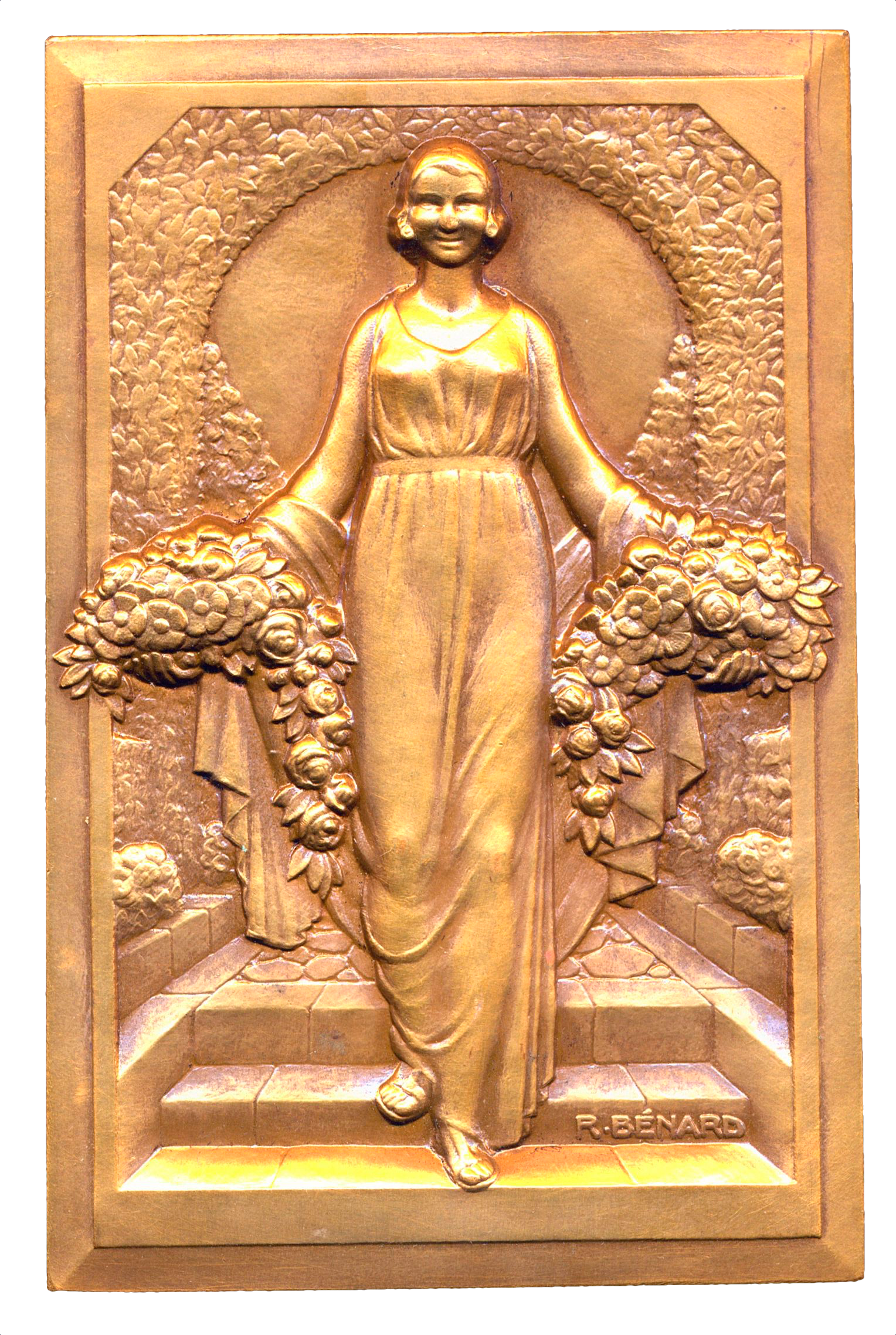 Obv: A female standing/walking on garden stairs toward observer before an archway or portal made of flowers, large bouquets of flowers in woman's hands, Medallist's Signature below