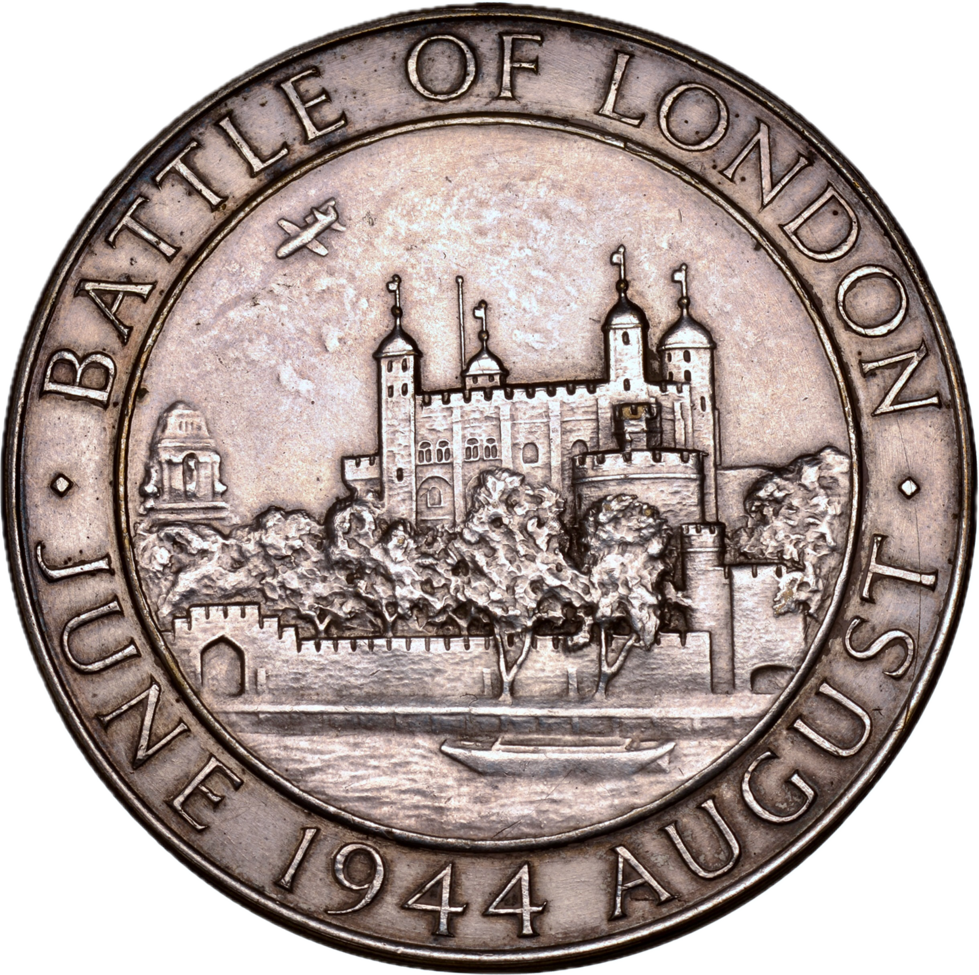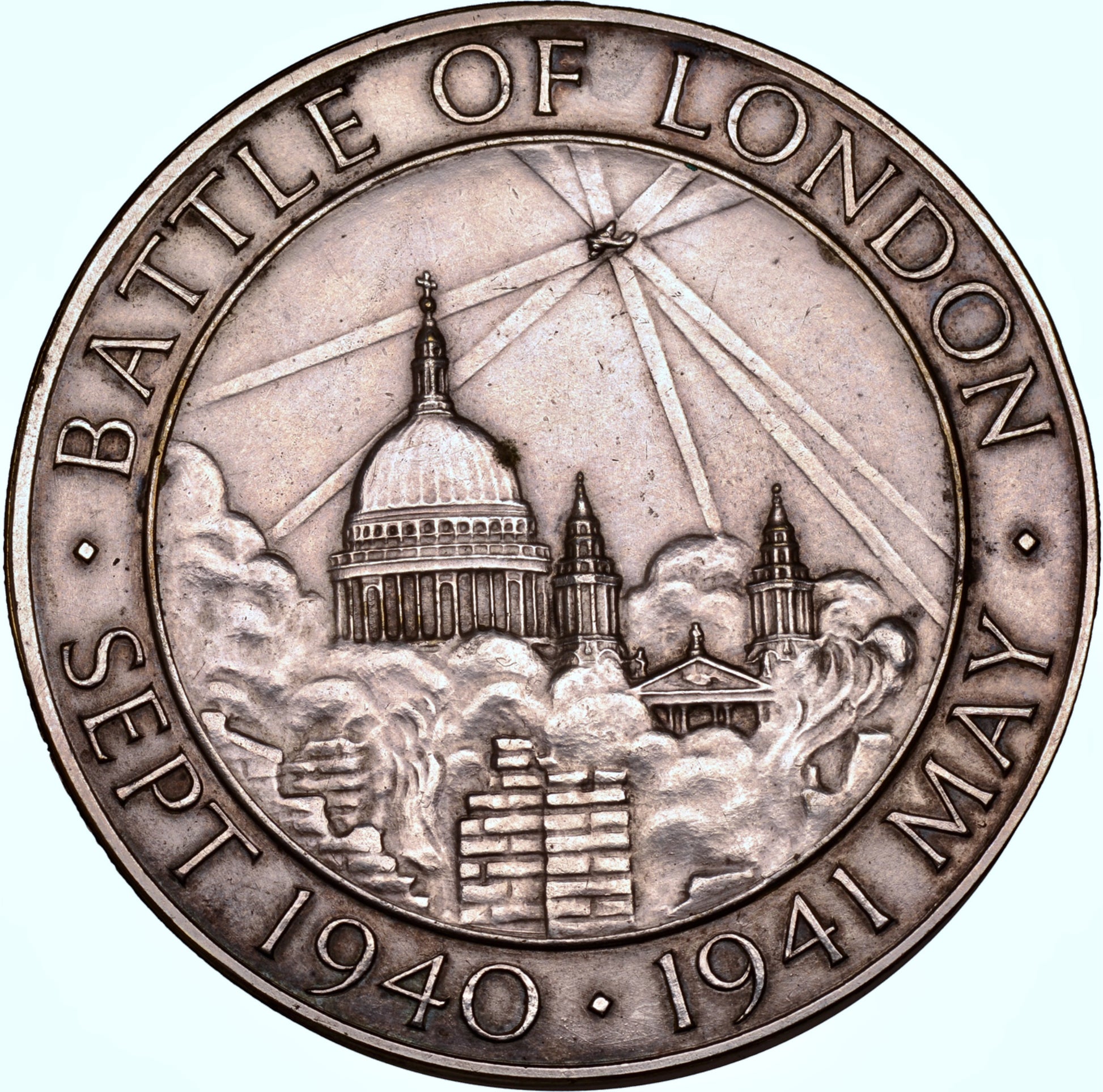 Obv: searchlights fixing on bomber over St. Pauls Cathedral in plumes of smoke