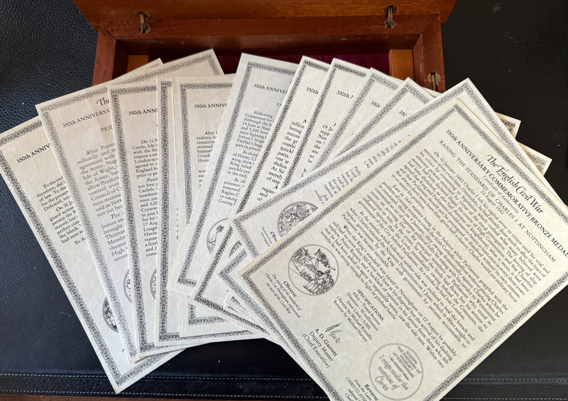 The series comprises a set of twelve medallions, each of 50m, each a fine engraving of a different scene from the English Civil War, by leading contemorary sculptors.