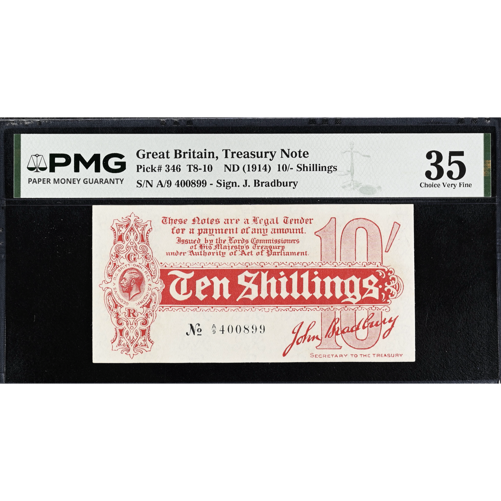 ENGLAND P.346 T9 1914 HM Treasury 1914 Bradbury 10s A/9 Choice VF 35