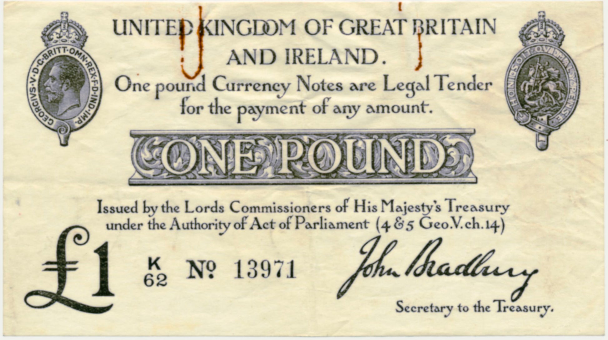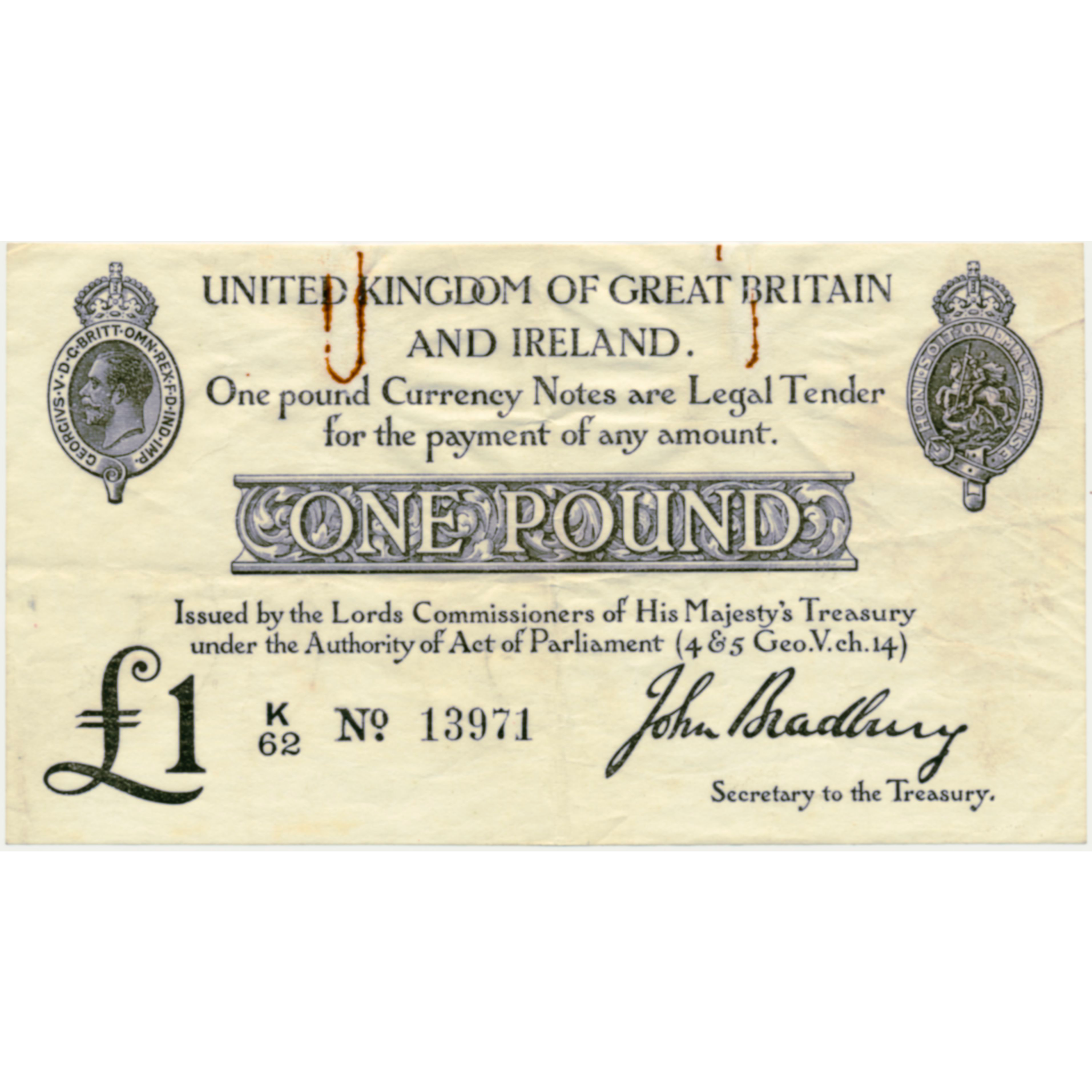 ENGLAND P.349a T11.1 1914 HM Treasury Bradbury £1 NVF K/62