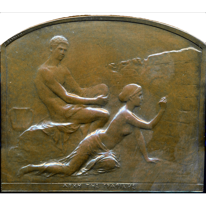 Obverse: an Athenian seated on a rock watching a young woman crouching on the ground, drawing the outlines of her shadow with a stylus on to a wall, APXH THE IPAPIKHE