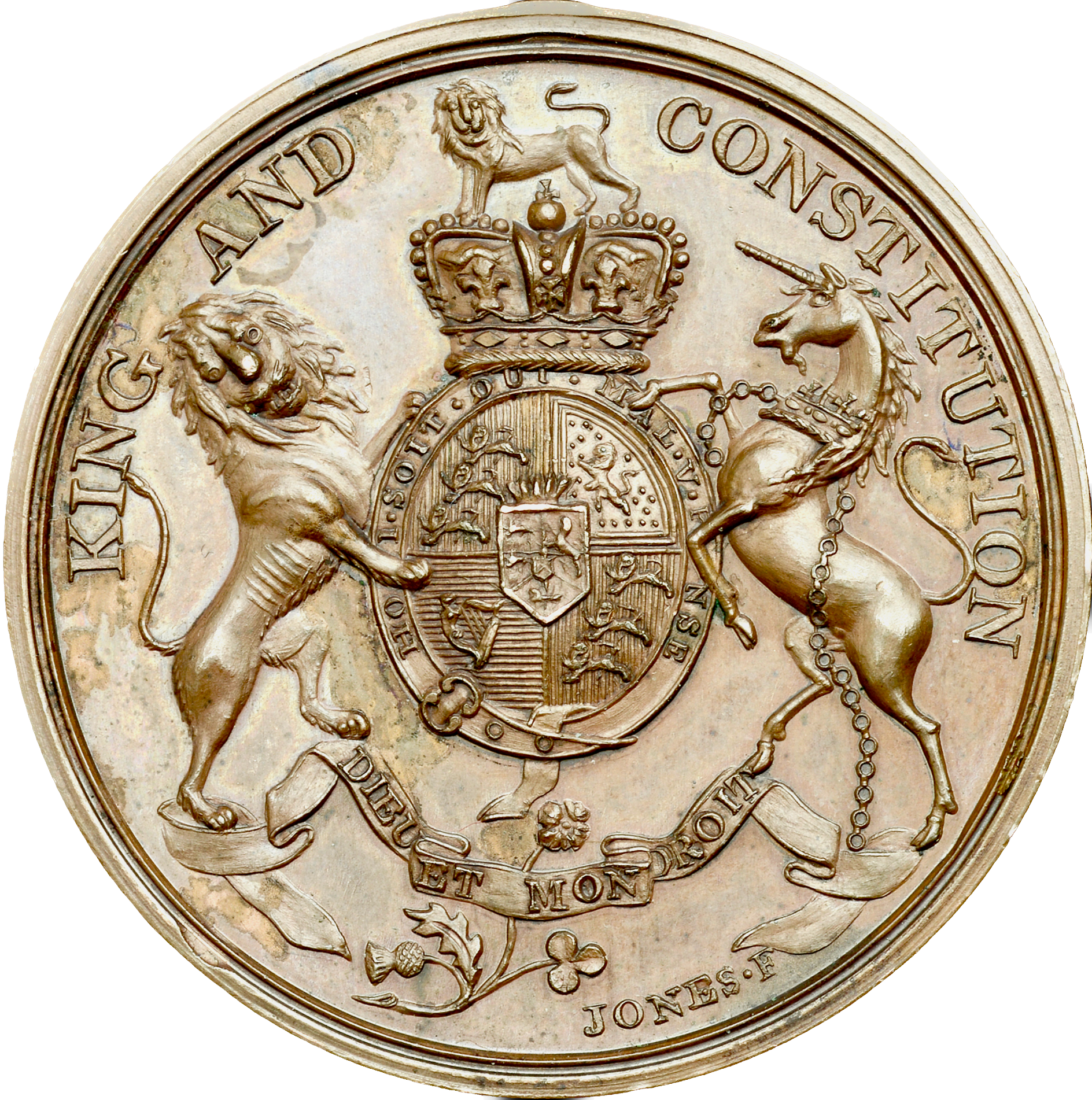 Rev: Royal arms and supporters to upper part, KING AND CONSTITUTION.