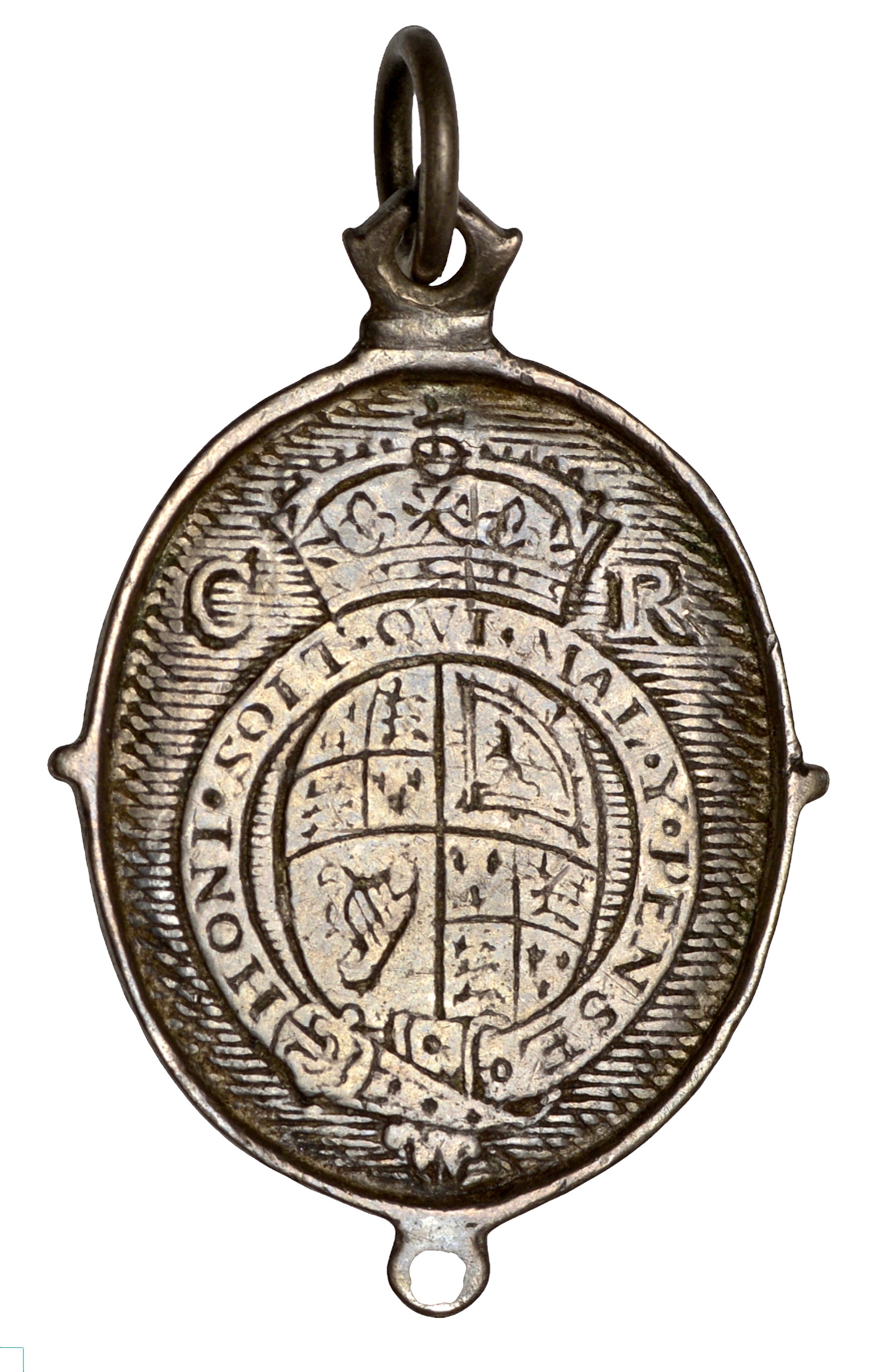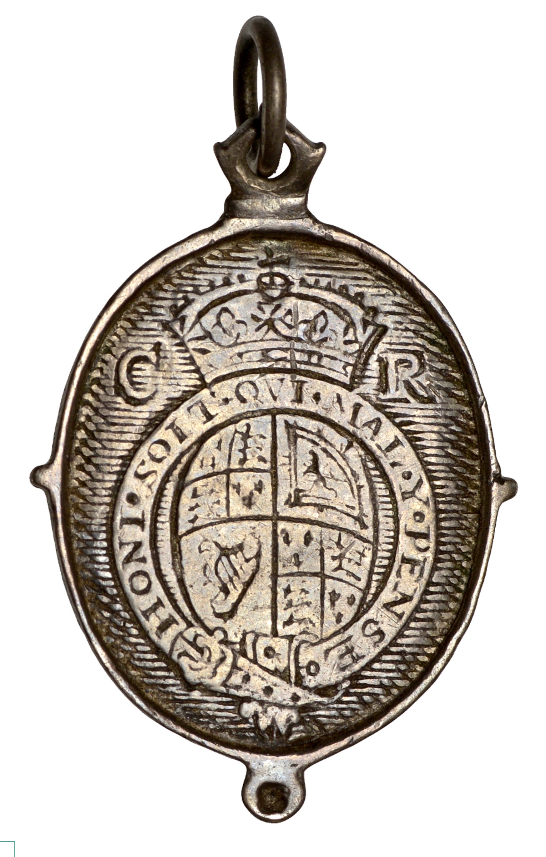 - Badge worn as medal or ornament as a sign of affection for the monarchy and must have been made when in exile or very soon after the restoration.