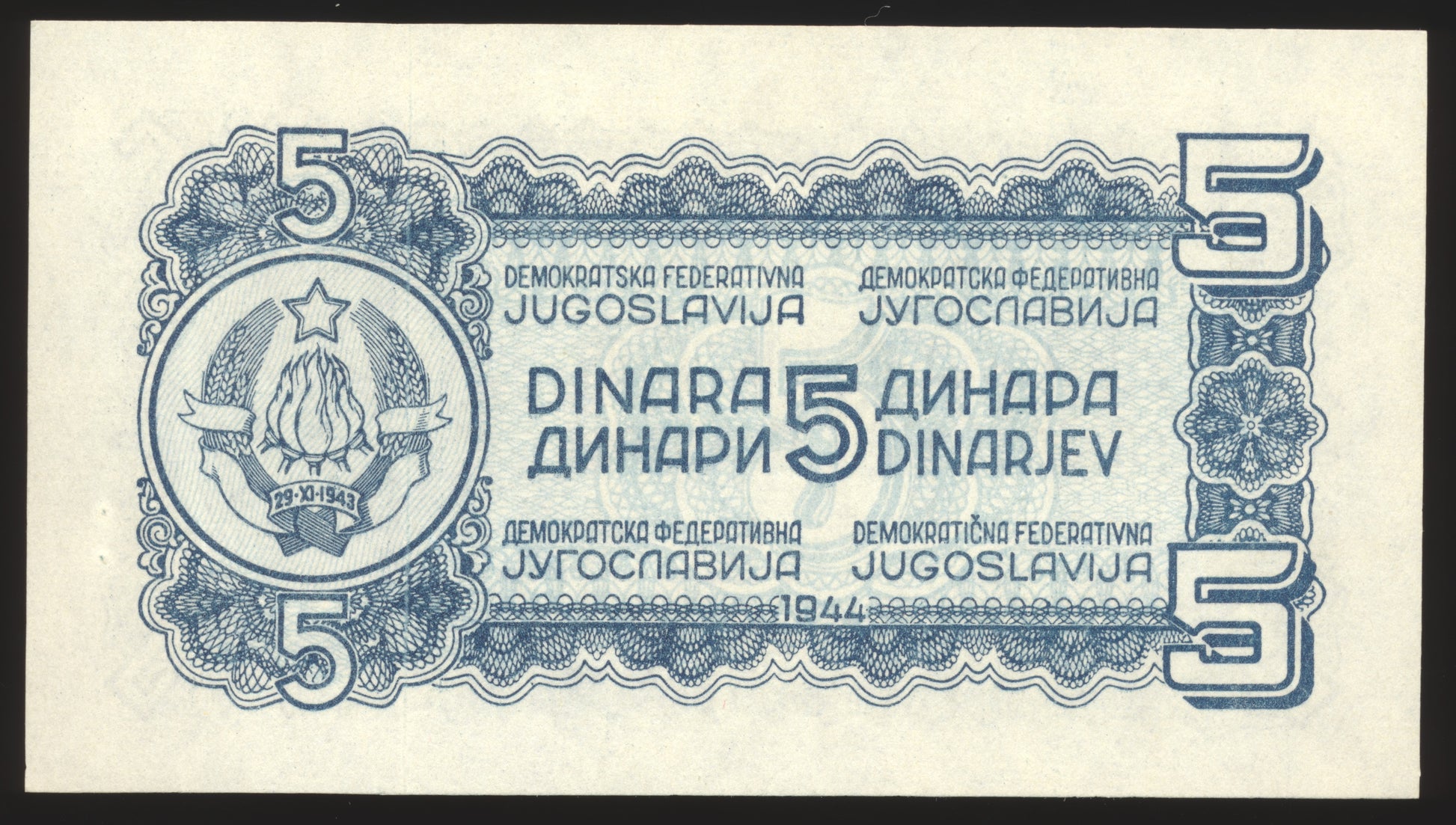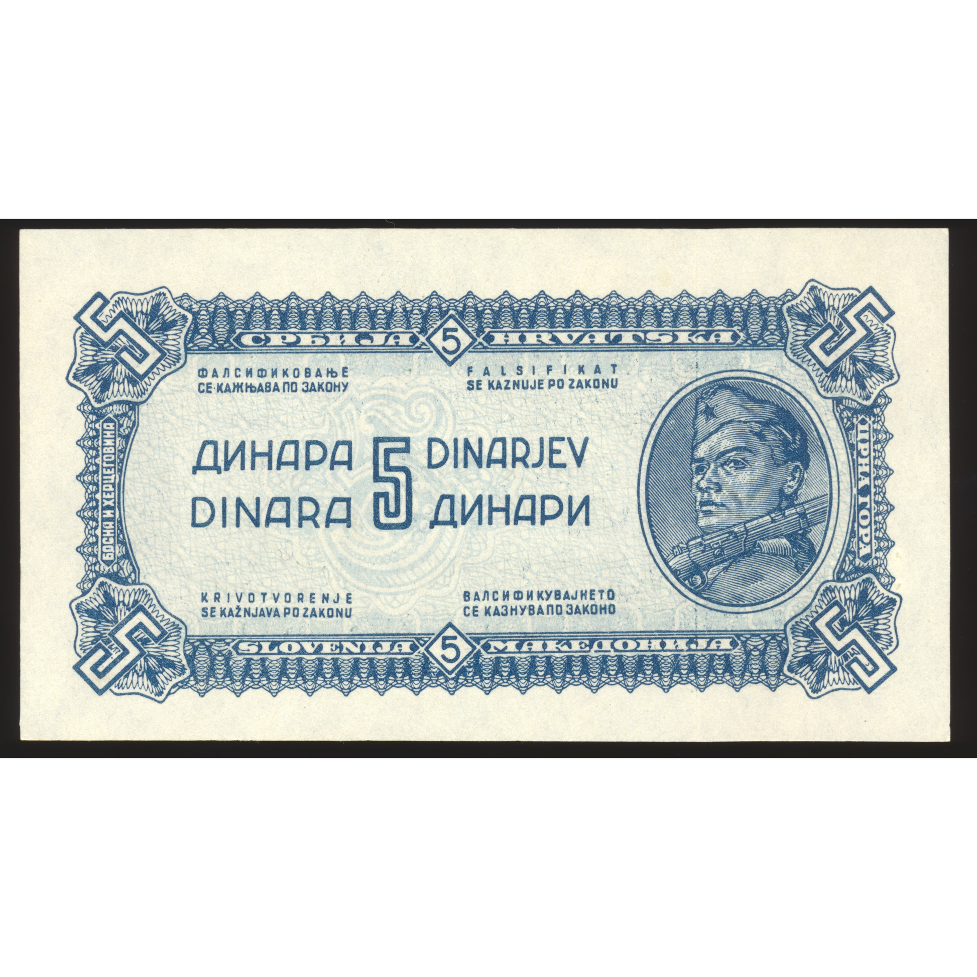 YUGOSLAVIA P.49b with thin security thread 1944. 5 Dinar UNC