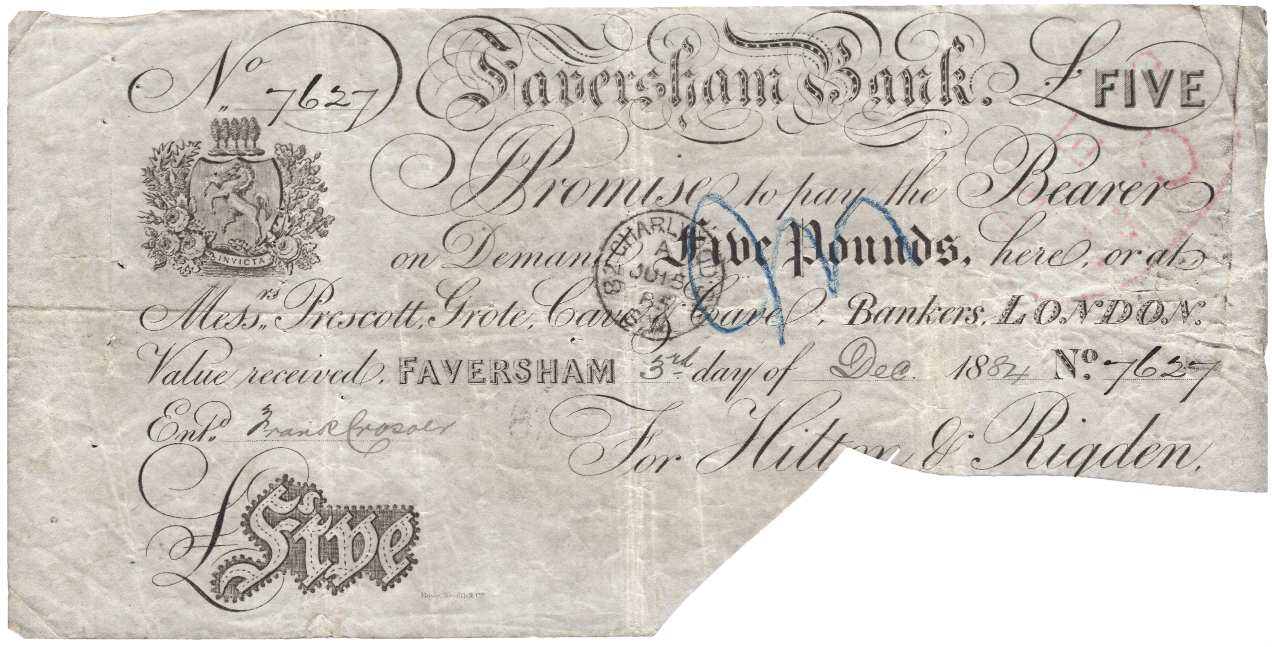 Faversham Bank 1884 £5 banknote Outing 786d