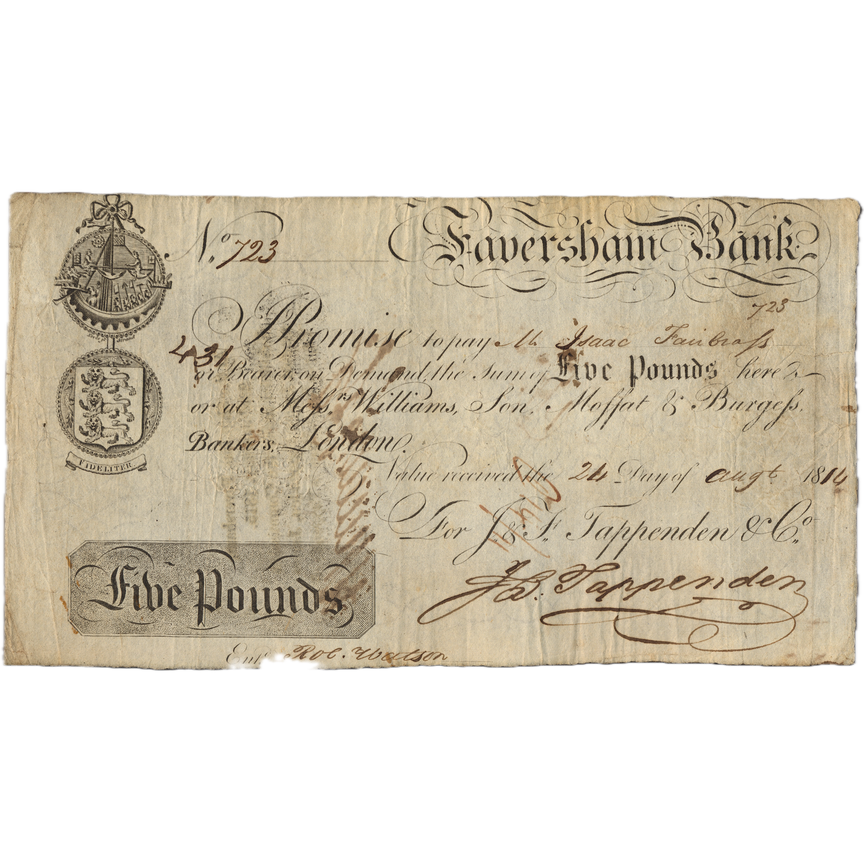 Faversham Bank 1814 £5 banknote Outing 785b