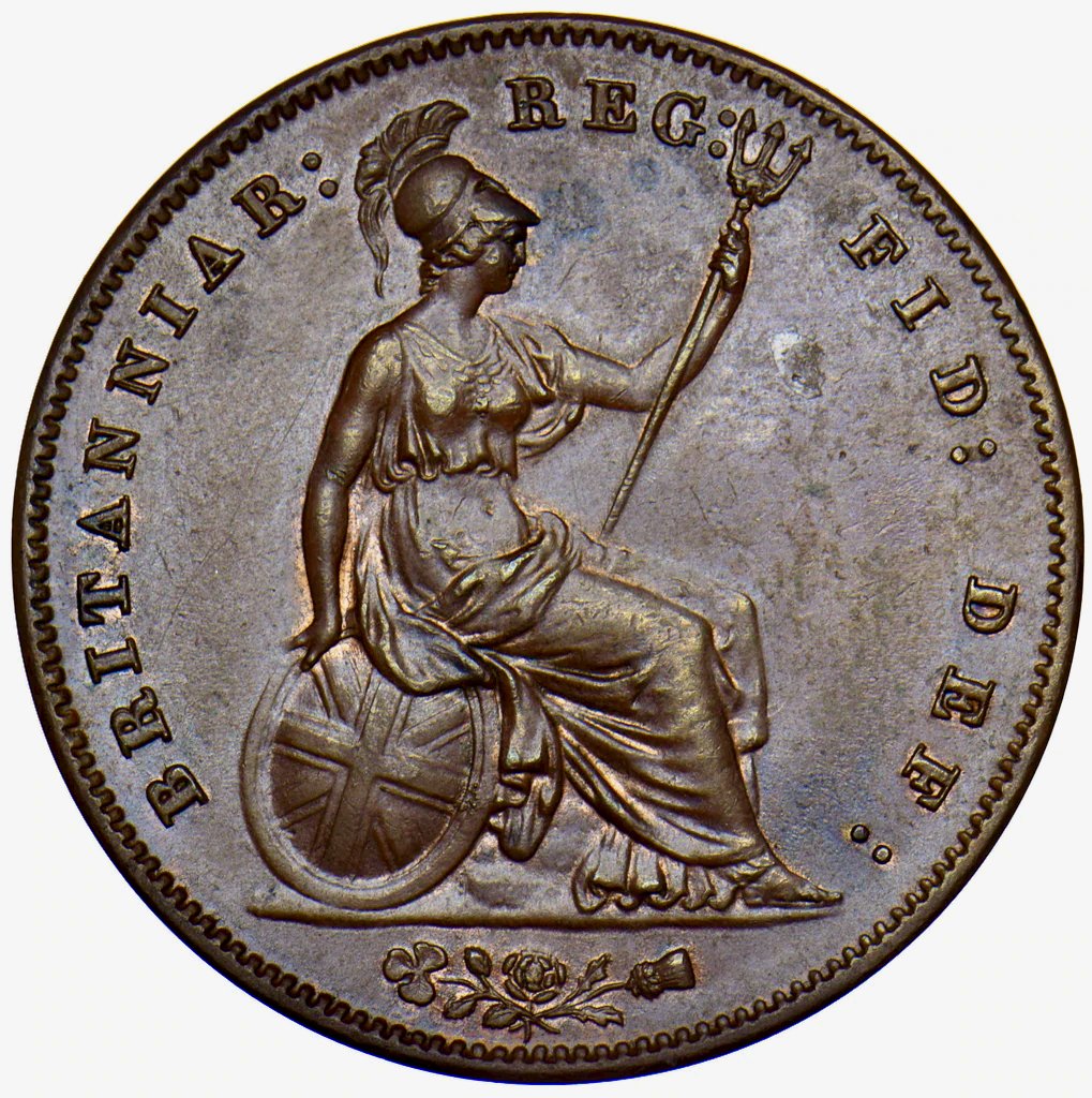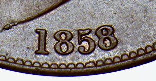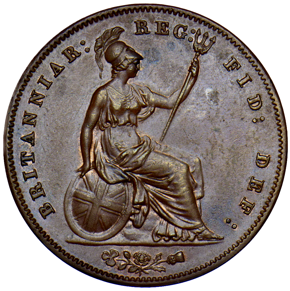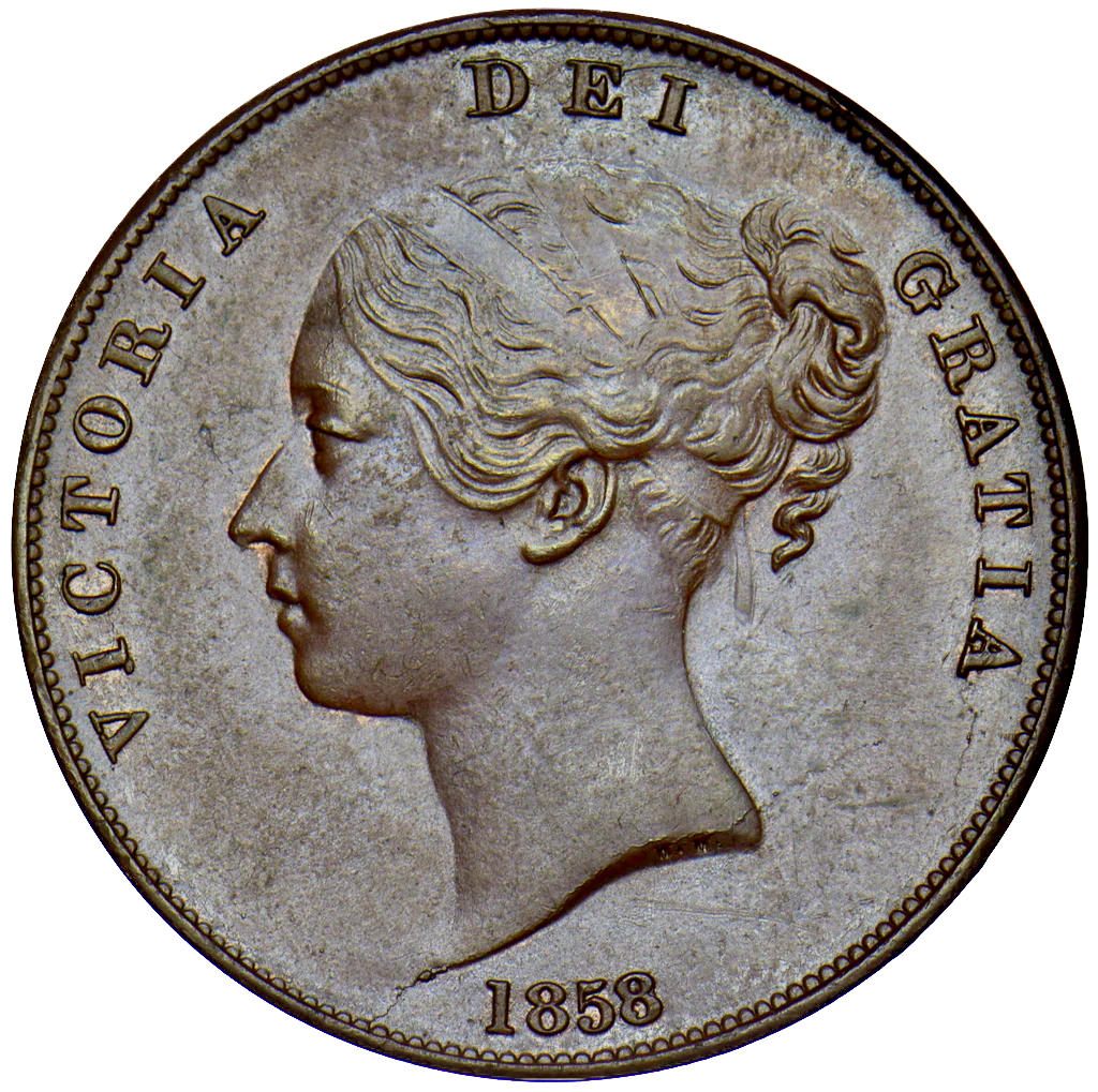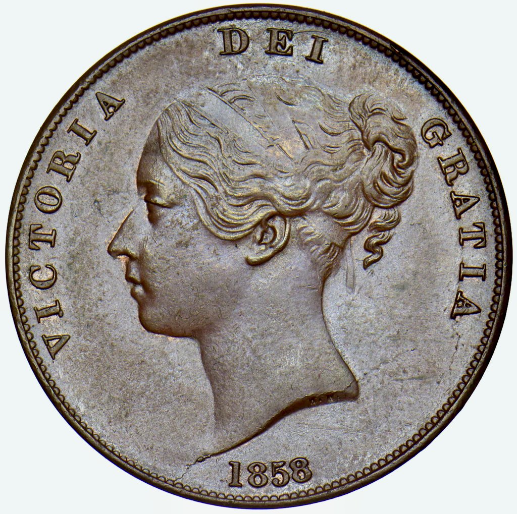 1858/3 Penny WW Far colon Ornamental trident BMC 1515 Extremely rare AUNC
