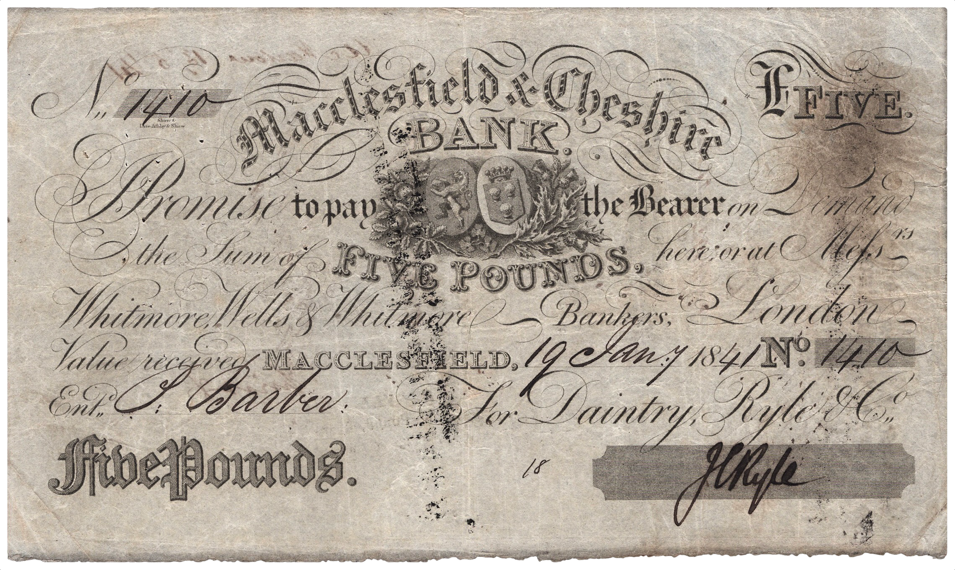 Macclesfield & Cheshire Bank 1841 £5 banknote Outing 1319b