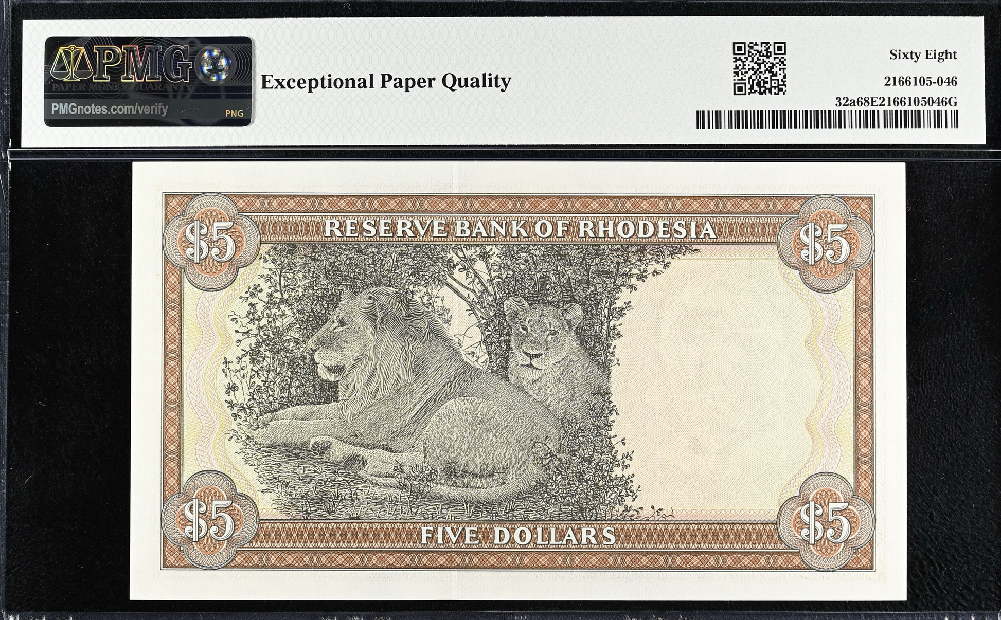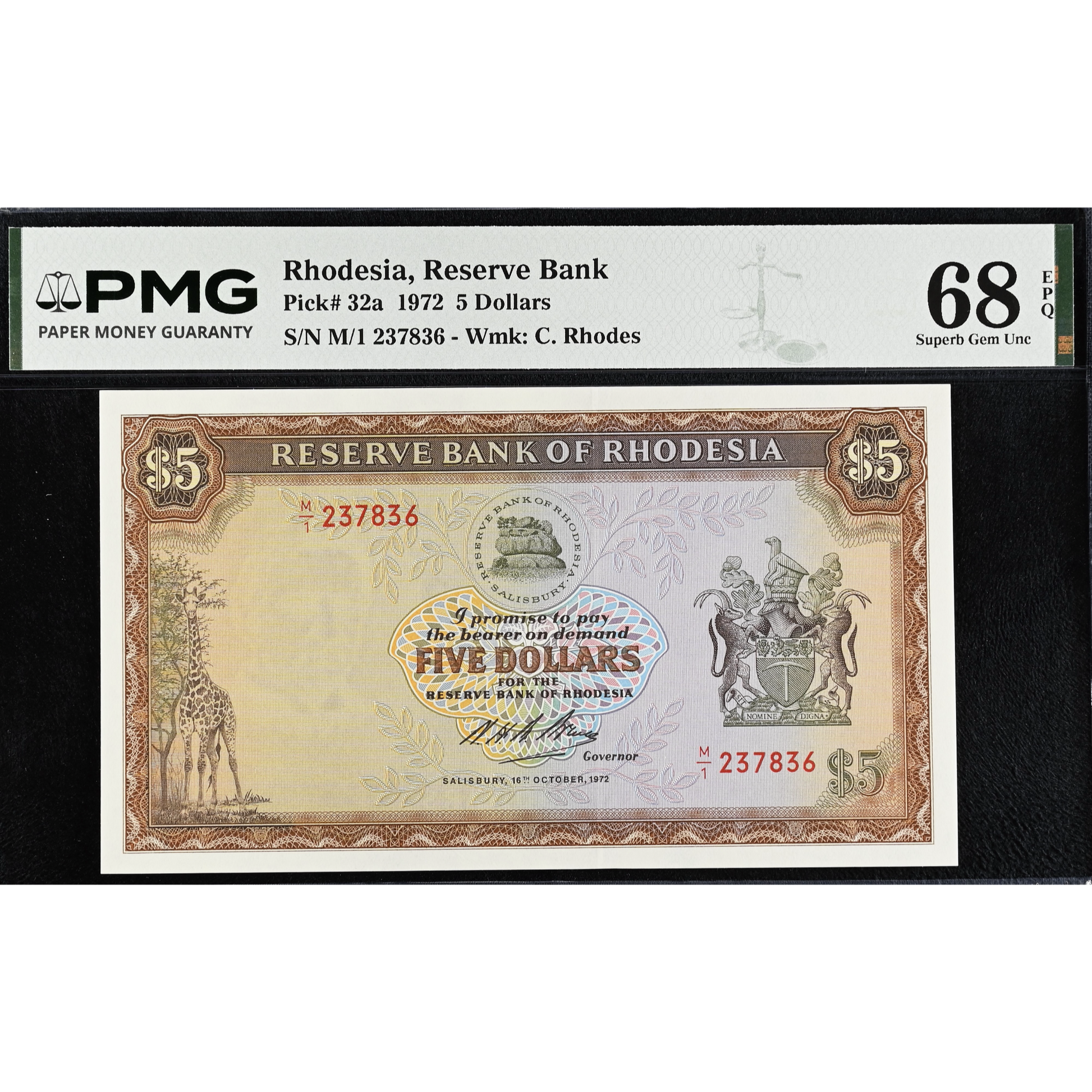 RHODESIA P.32a 1972 5 dollar Superb Gem UNC 68 EPQ