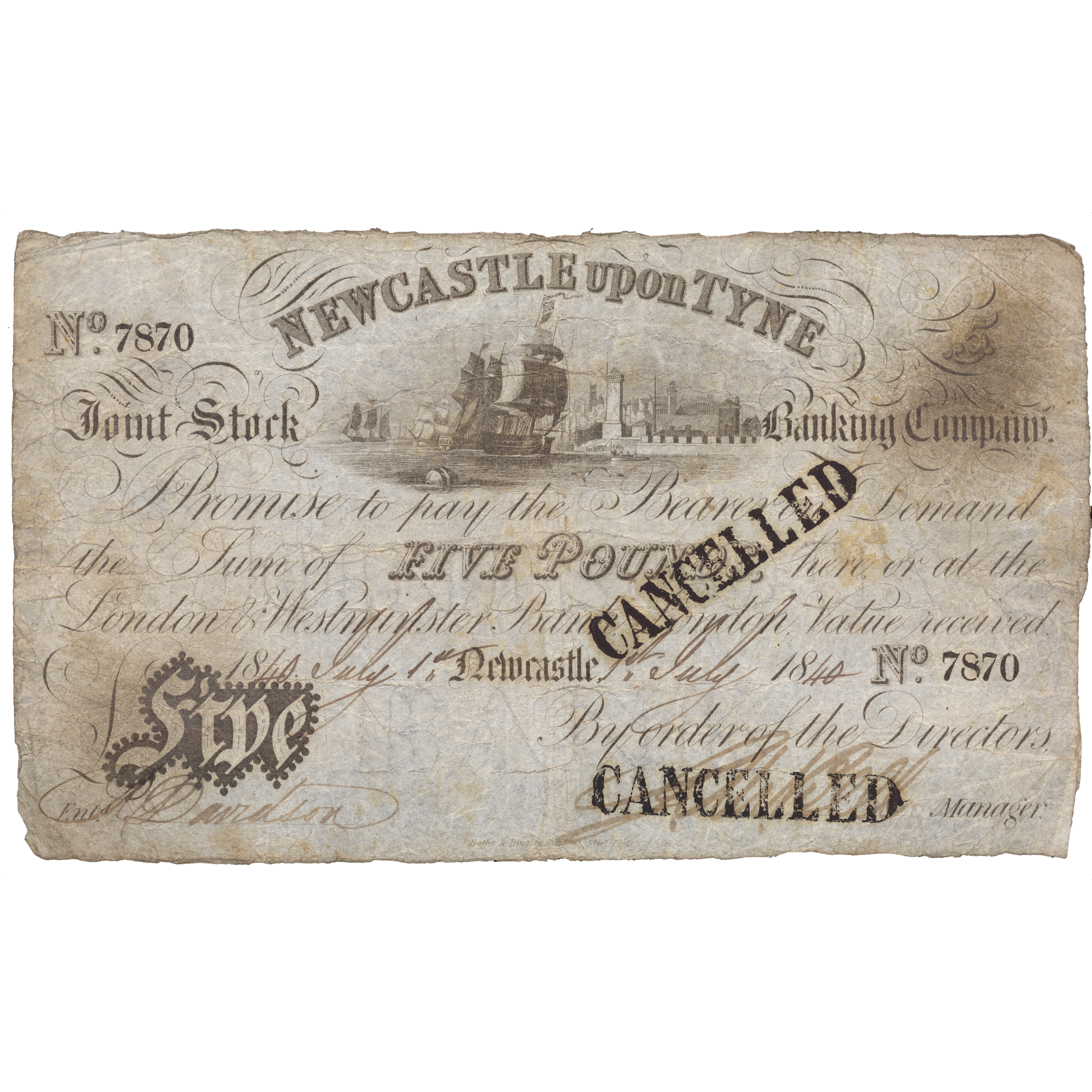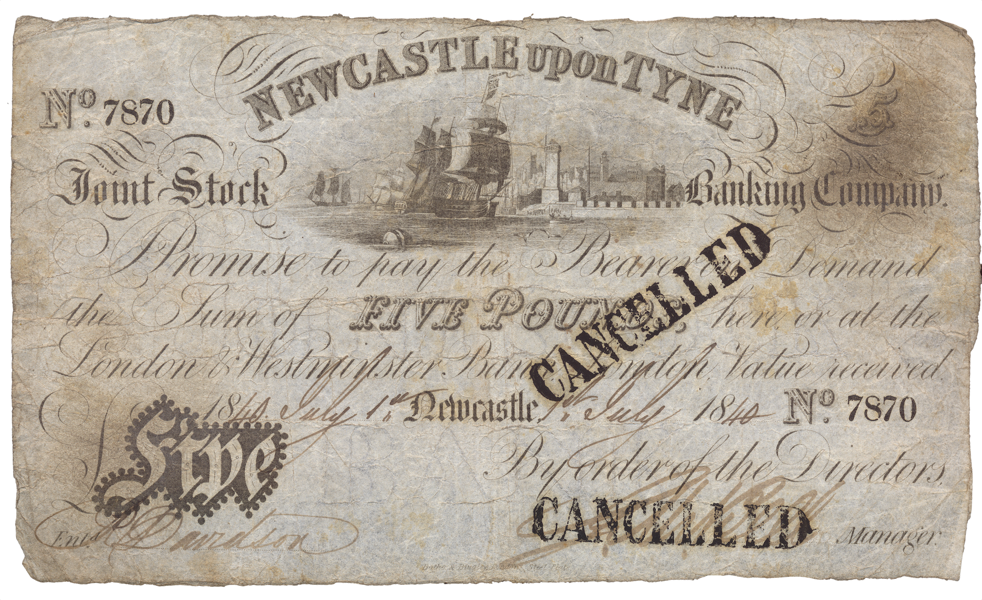 Newcastle upon Tyne Joint Stock Bank 1840 £5 banknote Outing 1515b