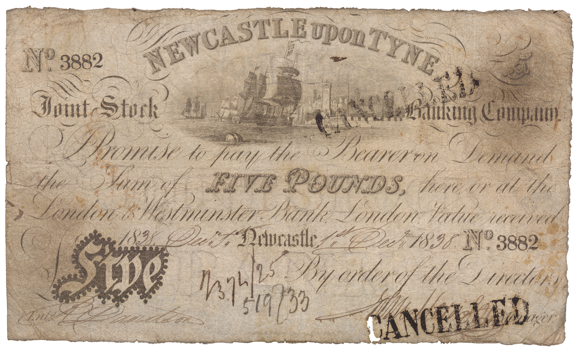 Newcastle upon Tyne Joint Stock Bank 1838 £5 banknote Outing 1515b