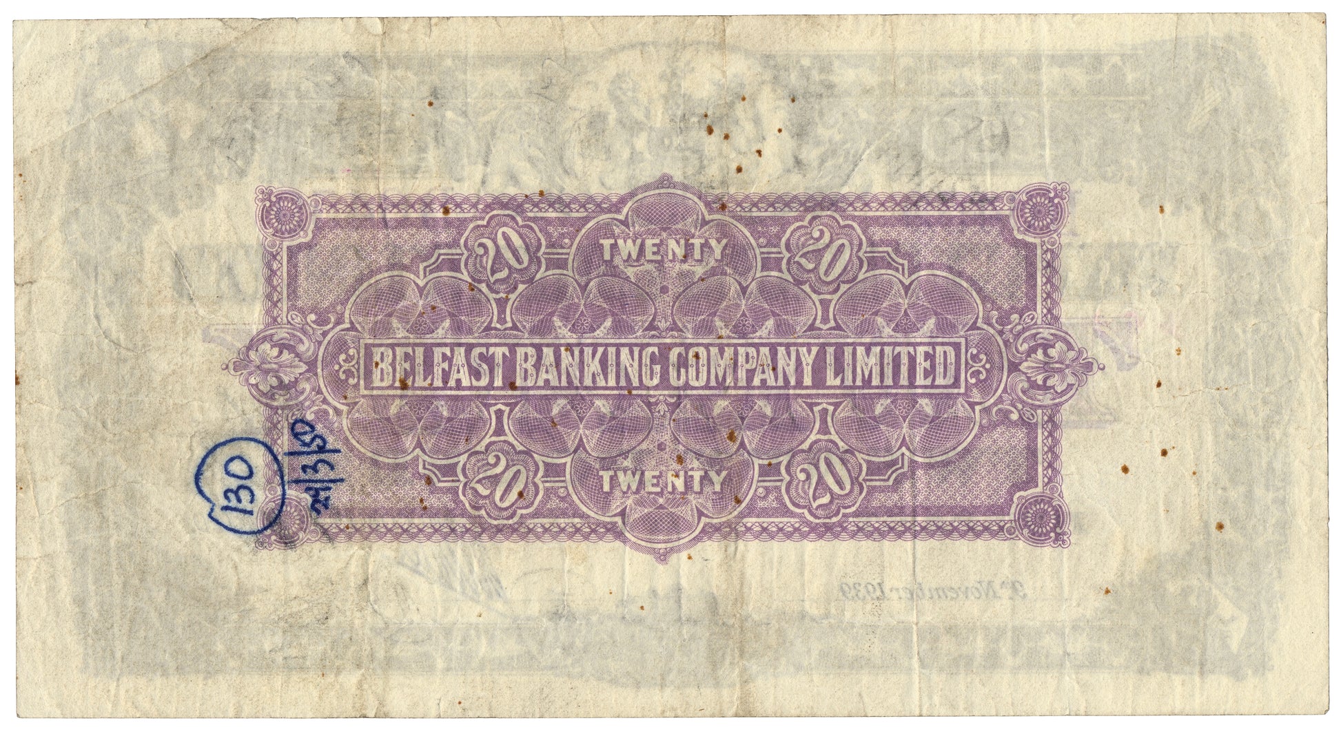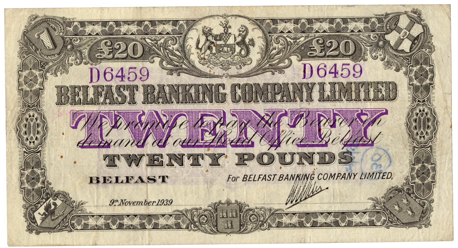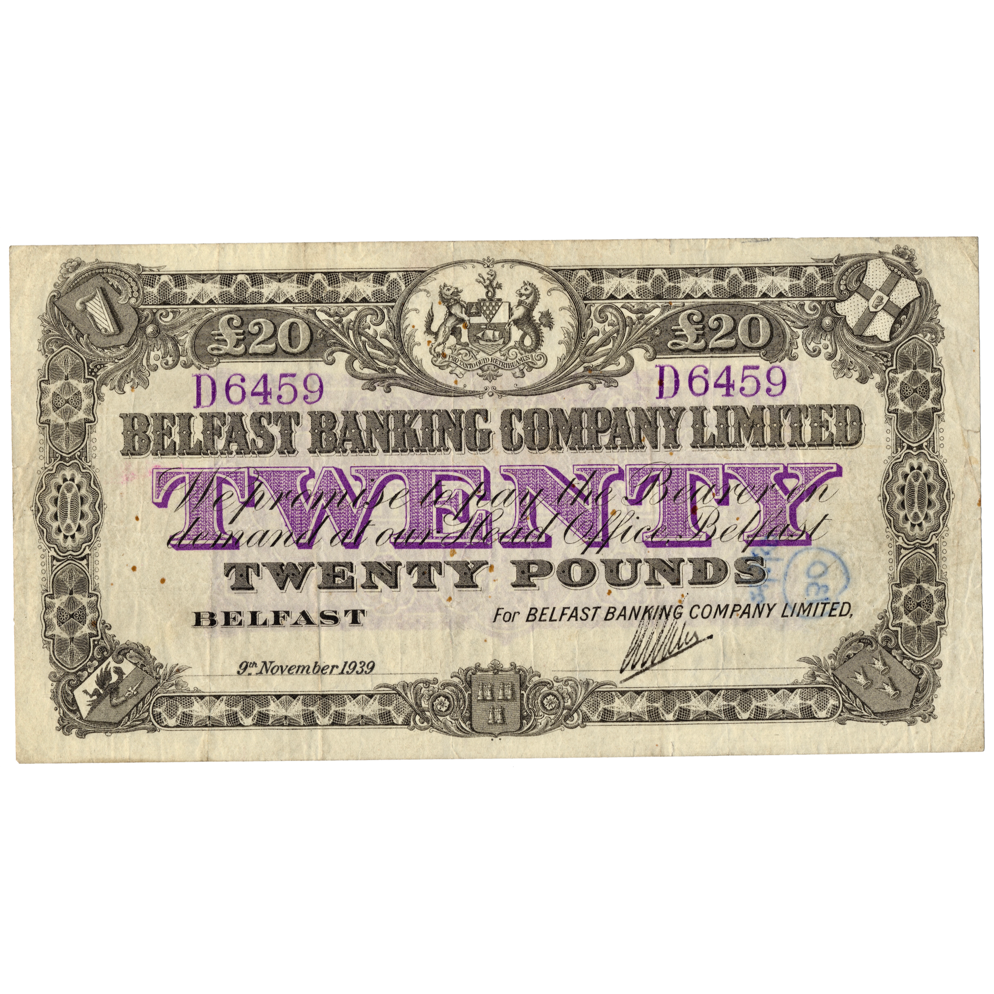 NORTHERN IRELAND P.129b NI304a 1939 Belfast Banking Co Ltd £20 VF20