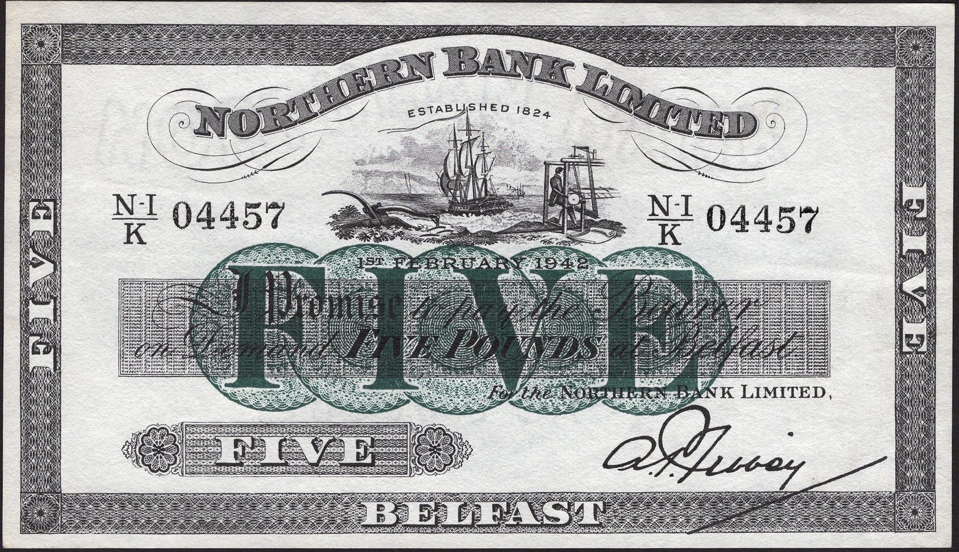 NORTHERN IRELAND P.180b NI613d 1942 Northern Bank £5 AUNC