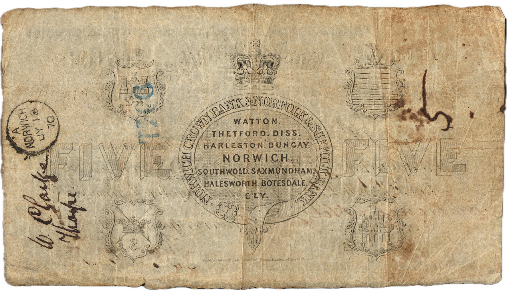 Norwich Crown Bank & Norfolk & Suffolk Bank 1869 £5 banknote Outing 1606k