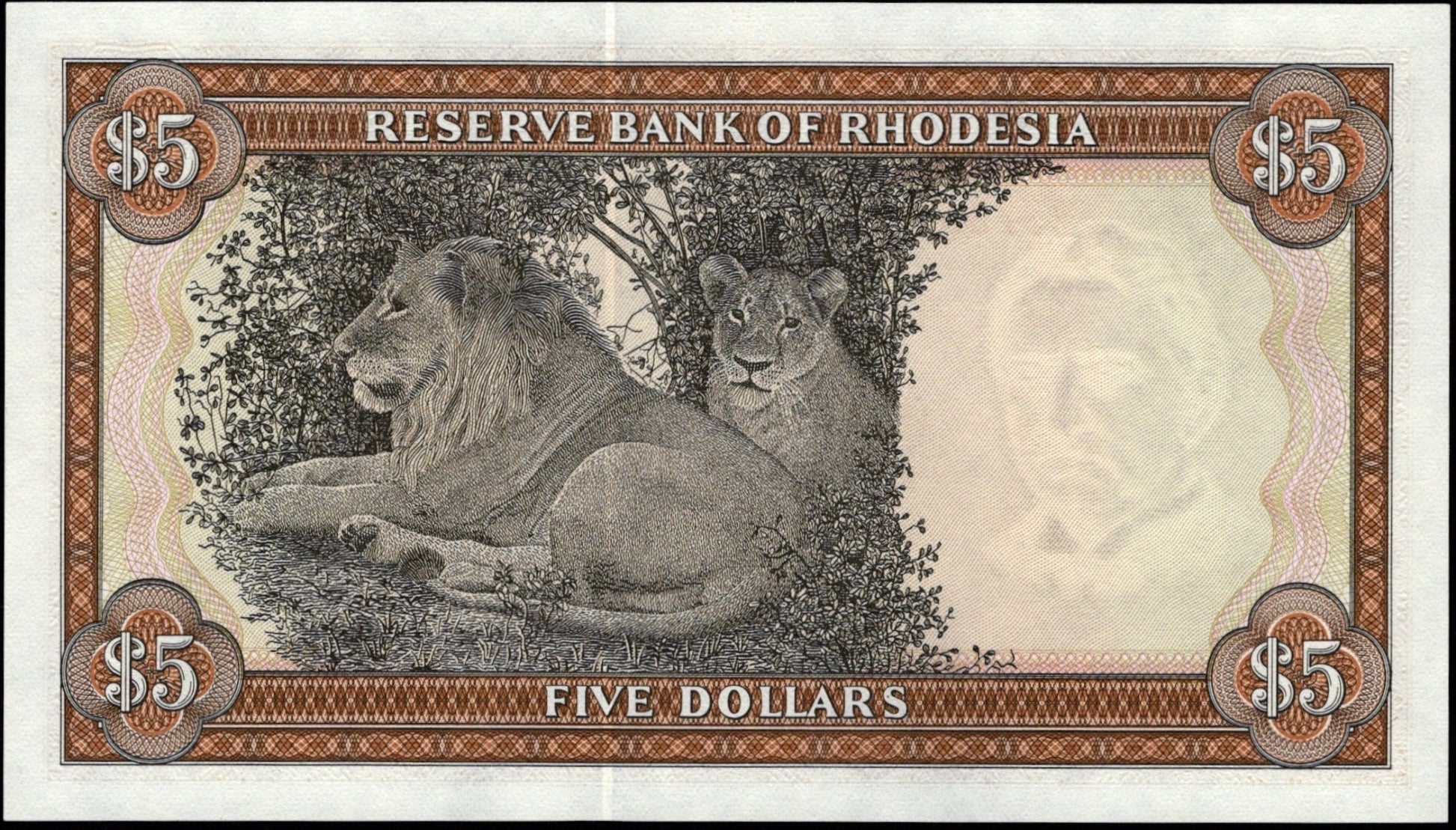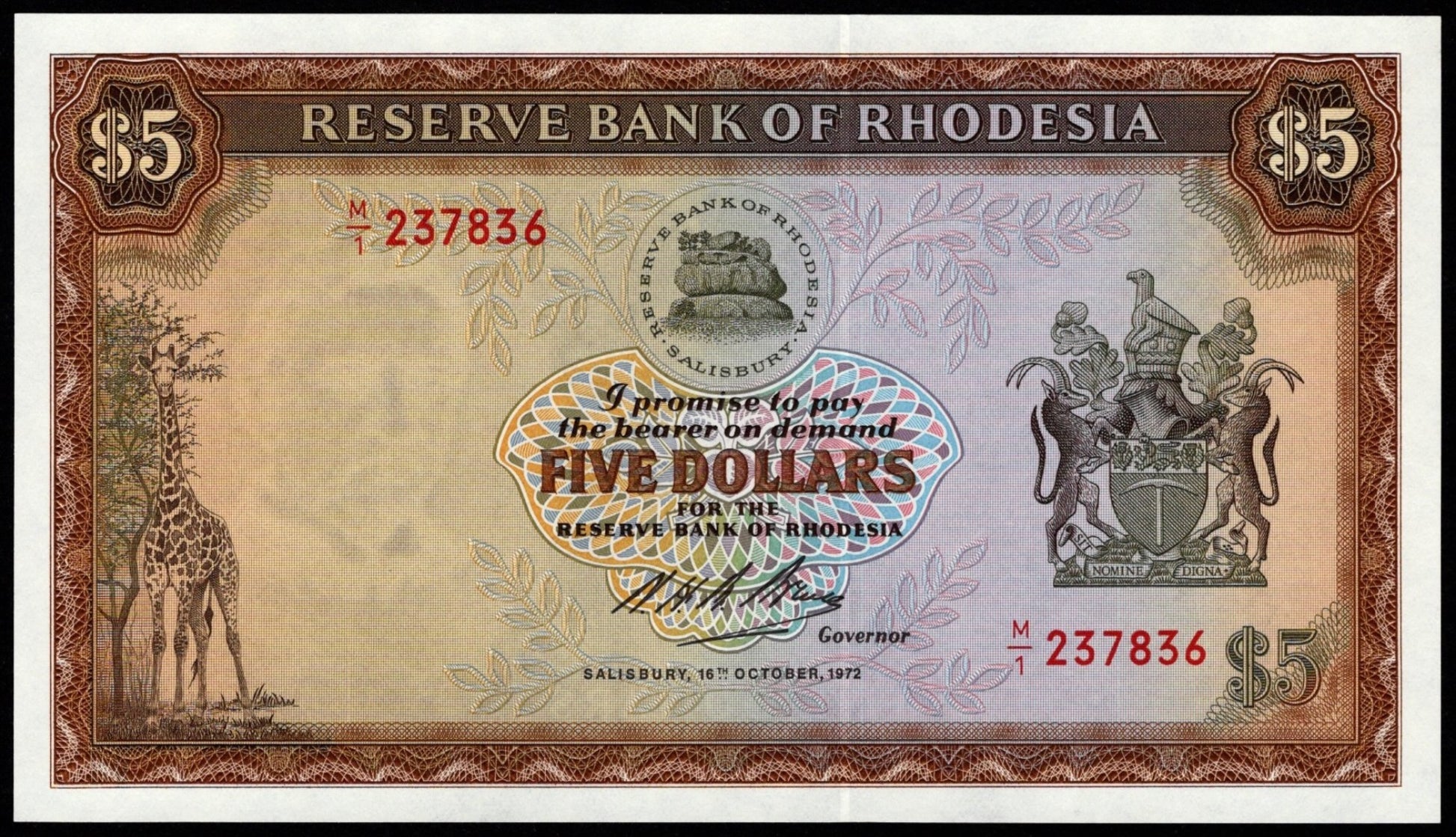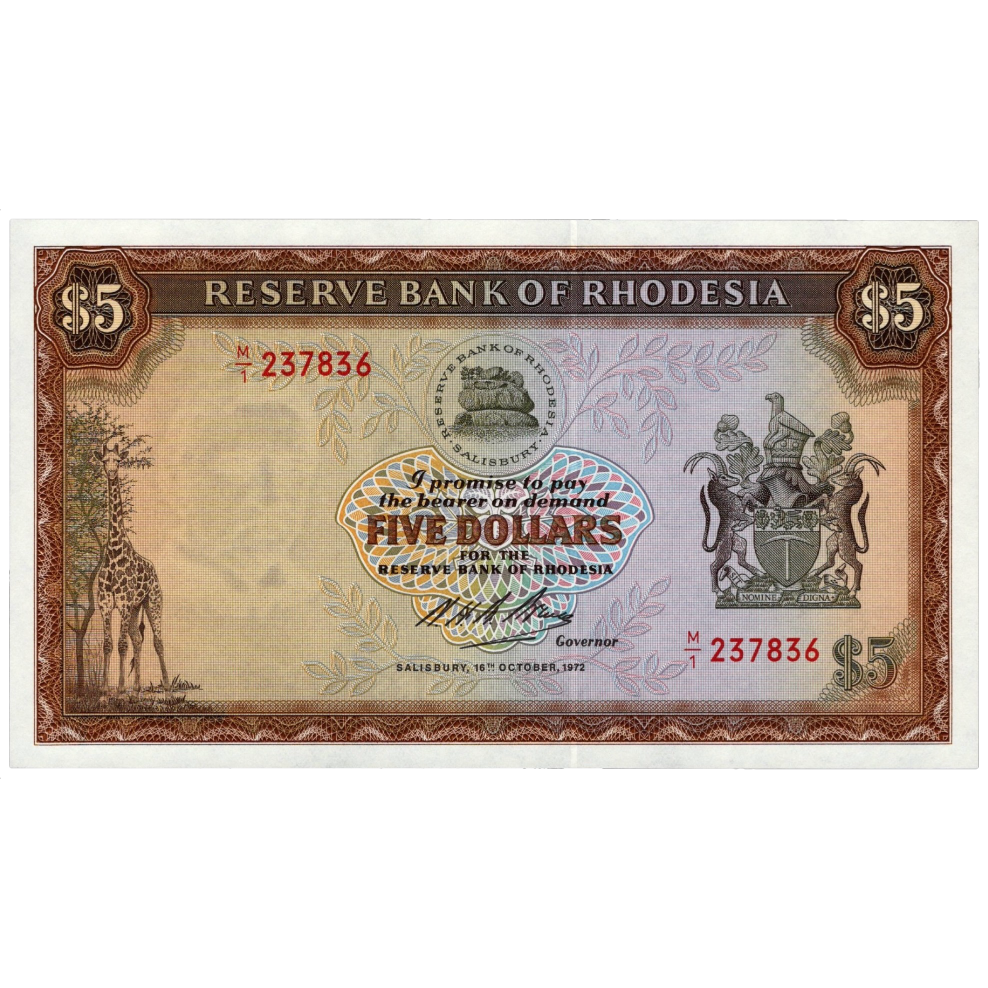 RHODESIA P.32 1972 rare first run M/1 prefix 5 dollars UNC