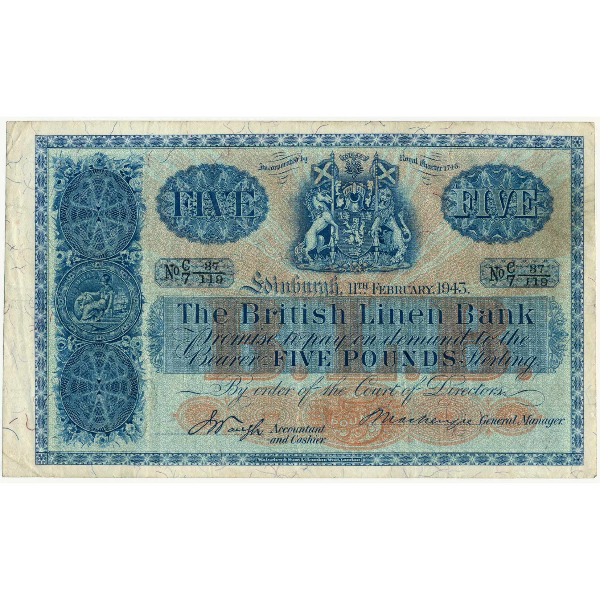 SCOTLAND P.158b SC213c 1943 British Linen Bank First series £5 GVF C/7