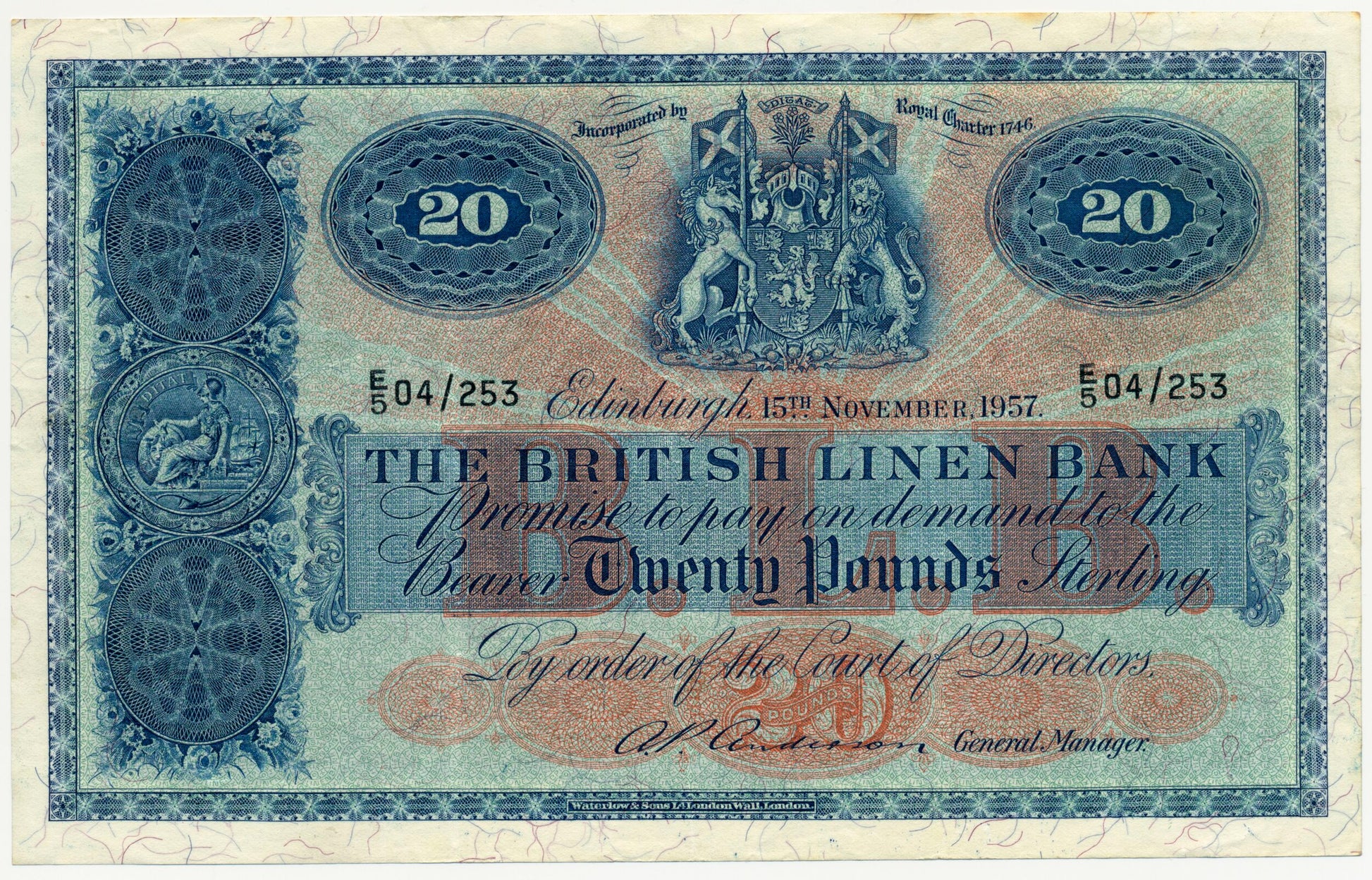 SCOTLAND P.159b SC235b 1957 British Linen Bank £20 VF E/5